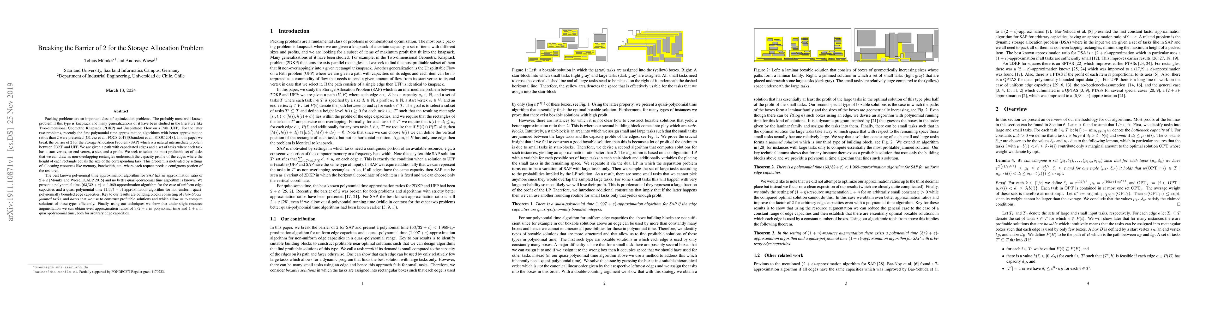 Packing problems are an important class of optimization problems. The probably most well-known problem if this type is knapsack and many generalizations of it have been studied in the literature like Two-dimensional Geometric Knapsack (2DKP) and Unsplittable Flow on a Path (UFP). For the latter two problems, recently the first polynomial time approximation algorithms with better approximation ratios than 2 were presented [G\'alvez et al., FOCS 2017][Grandoni et al., STOC 2018]. In this paper we break the barrier of 2 for the Storage Allocation Problem (SAP) which is a natural intermediate problem between 2DKP and UFP. We are given a path with capacitated edges and a set of tasks where each task has a start vertex, an end vertex, a size, and a profit. We seek to select the most profitable set of tasks that we can draw as non-overlapping rectangles underneath the capacity profile of the edges where the height of each rectangle equals the size of the corresponding task. This problem is motivated by settings of allocation resources like memory, bandwidths, etc. where each request needs a contiguous portion of the resource. The best known polynomial time approximation algorithm for SAP has an approximation ratio of 2+epsilon$ [M\"omke and Wiese, ICALP 2015] and no better quasi-polynomial time algorithm is known. We present a polynomial time (63/32) < 1.969-approximation algorithm for the case of uniform edge capacities and a quasi-polynomial time (1.997)-approximation algorithm for non-uniform quasi-polynomially bounded edge capacities. Finally, we show that under slight resource augmentation we can obtain approximation ratios of 3/2 + epsilon in polynomial time and 1 + epsilon in quasi-polynomial time, both for arbitrary edge capacities.