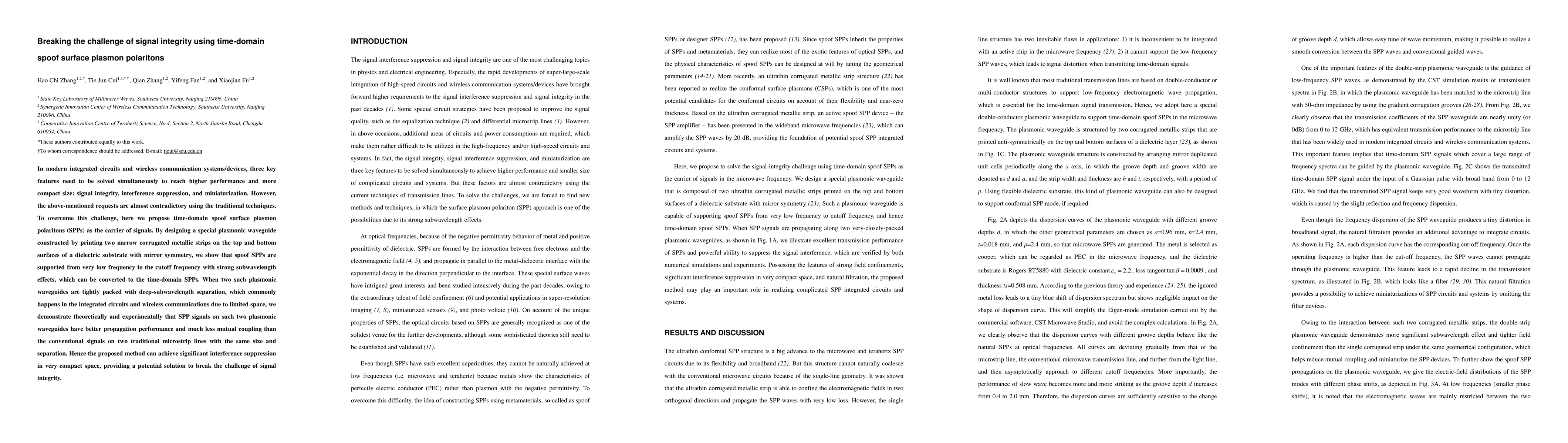 In modern integrated circuits and wireless communication systems/devices, three key features need to be solved simultaneously to reach higher performance and more compact size: signal integrity, interference suppression, and miniaturization. However, the above-mentioned requests are almost contradictory using the traditional techniques. To overcome this challenge, here we propose time-domain spoof surface plasmon polaritons (SPPs) as the carrier of signals. By designing a special plasmonic waveguide constructed by printing two narrow corrugated metallic strips on the top and bottom surfaces of a dielectric substrate with mirror symmetry, we show that spoof SPPs are supported from very low frequency to the cutoff frequency with strong subwavelength effects, which can be converted to the time-domain SPPs. When two such plasmonic waveguides are tightly packed with deep-subwavelength separation, which commonly happens in the integrated circuits and wireless communications due to limited space, we demonstrate theoretically and experimentally that SPP signals on such two plasmonic waveguides have better propagation performance and much less mutual coupling than the conventional signals on two traditional microstrip lines with the same size and separation. Hence the proposed method can achieve significant interference suppression in very compact space, providing a potential solution to break the challenge of signal integrity.