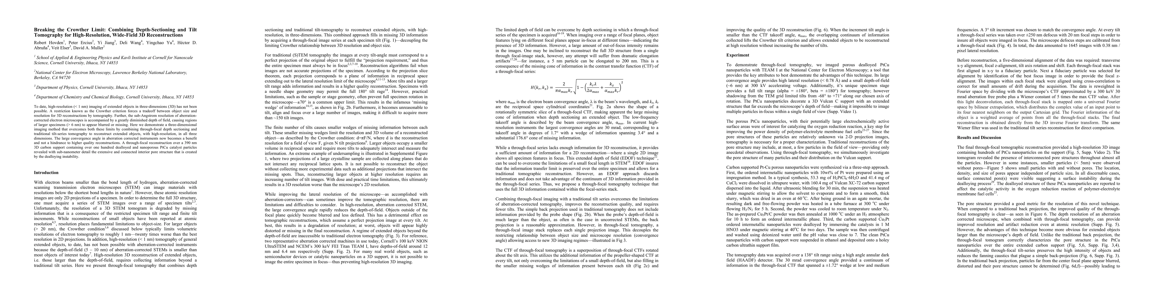 This paper presents a novel method combining depth-sectioning and tilt tomography to achieve high-resolution 3D reconstructions of extended objects, overcoming the Crowther limit and enhancing the depth of field in electron microscopy. The technique successfully reveals the intricate pore structures of nanoporous PtCu catalyst particles with sub-nanometer detail.