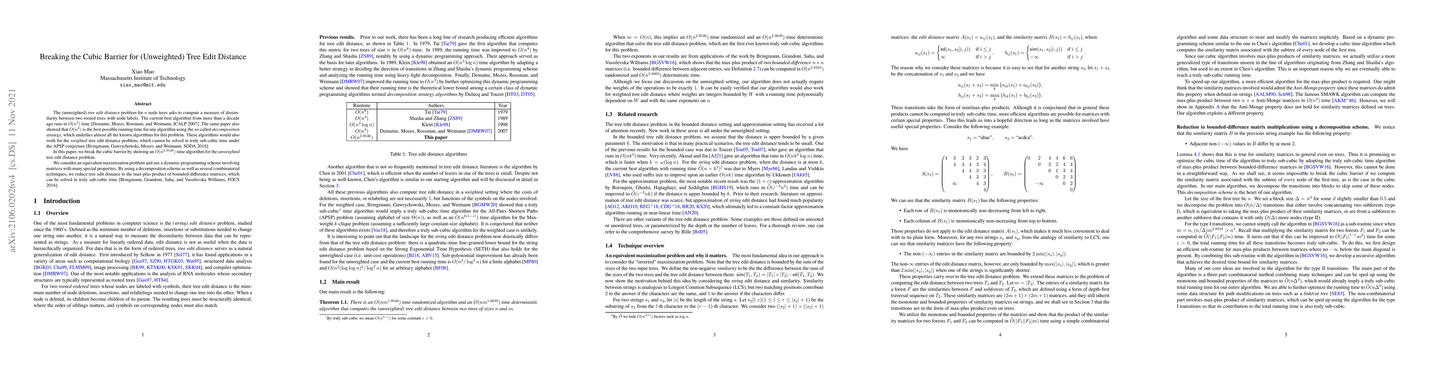 This paper presents an $O(n^{2.9546})$ time algorithm for computing the unweighted tree edit distance, breaking the previous cubic barrier of $O(n^3)$. The authors employ a dynamic programming scheme and reduce the problem to solving the max-plus product of bounded-difference matrices, which is achievable in sub-cubic time.