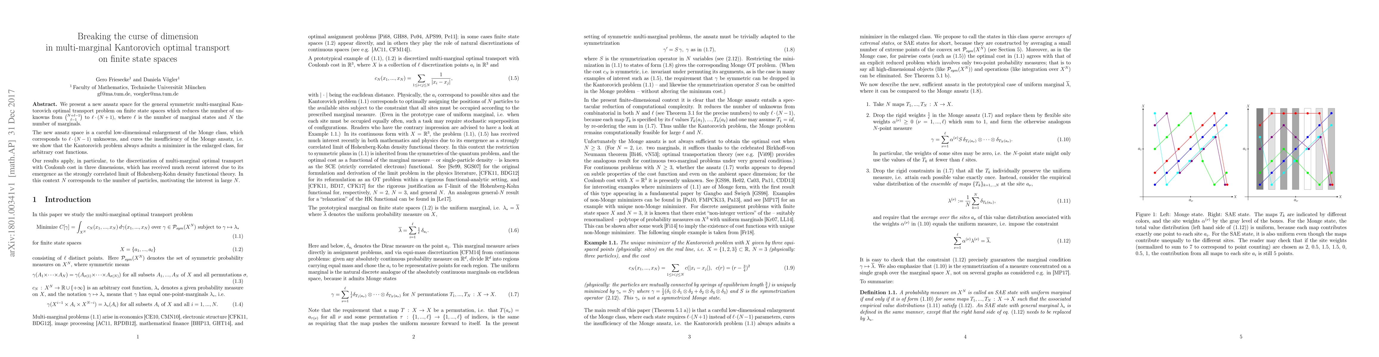 This paper introduces a new ansatz space to reduce the complexity of the multi-marginal Kantorovich optimal transport problem, decreasing the number of unknowns significantly. It also ensures the existence of a solution in the enlarged class, applicable to multi-particle systems in density functional theory.