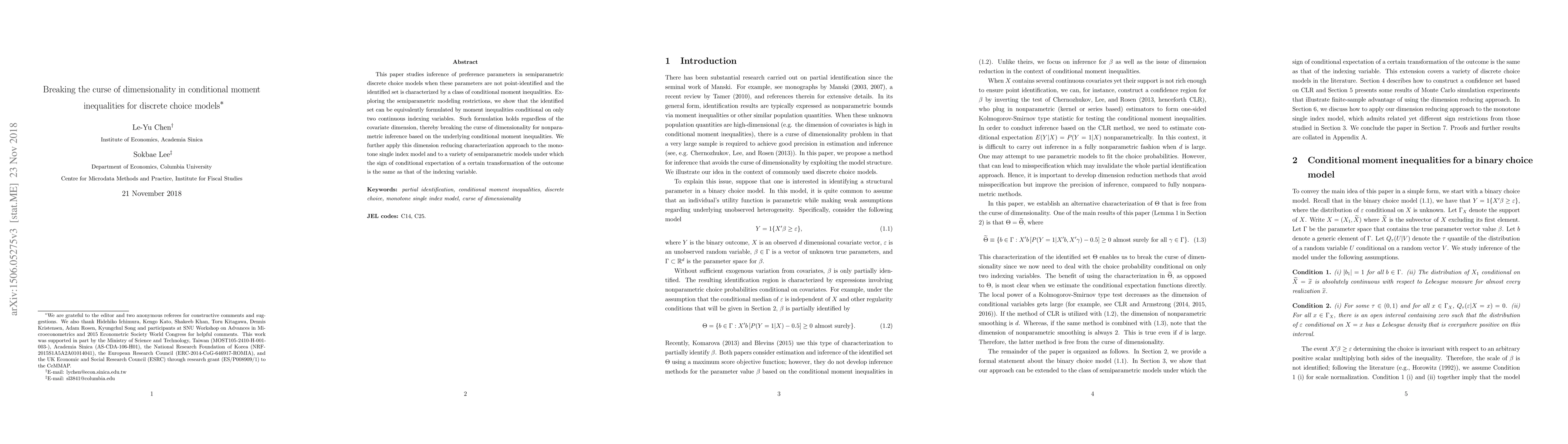 This paper proposes a method to overcome the curse of dimensionality in semiparametric discrete choice models by reformulating conditional moment inequalities using only two continuous indexing variables, thus simplifying inference regardless of covariate dimension. The approach is applied to the monotone single index model and various semiparametric models.