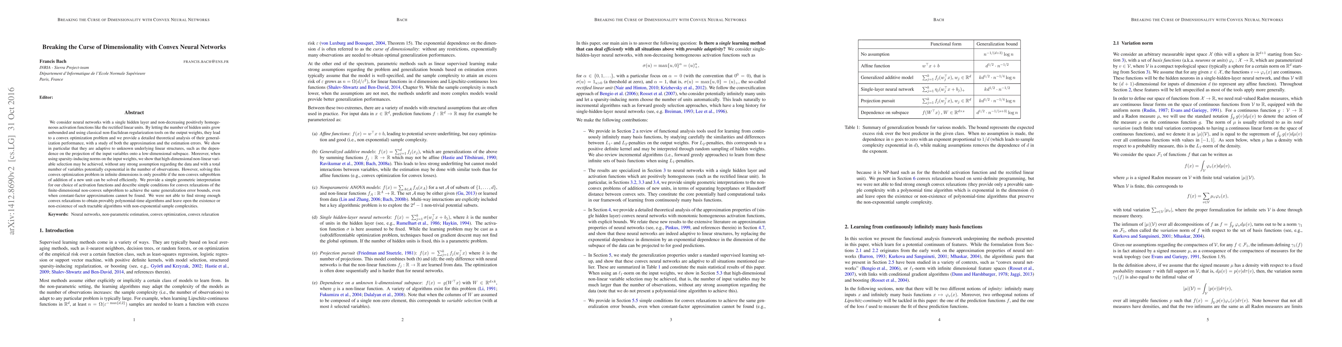 We consider neural networks with a single hidden layer and non-decreasing homogeneous activa-tion functions like the rectified linear units. By letting the number of hidden units grow unbounded and using classical non-Euclidean regularization tools on the output weights, we provide a detailed theoretical analysis of their generalization performance, with a study of both the approximation and the estimation errors. We show in particular that they are adaptive to unknown underlying linear structures, such as the dependence on the projection of the input variables onto a low-dimensional subspace. Moreover, when using sparsity-inducing norms on the input weights, we show that high-dimensional non-linear variable selection may be achieved, without any strong assumption regarding the data and with a total number of variables potentially exponential in the number of ob-servations. In addition, we provide a simple geometric interpretation to the non-convex problem of addition of a new unit, which is the core potentially hard computational element in the framework of learning from continuously many basis functions. We provide simple conditions for convex relaxations to achieve the same generalization error bounds, even when constant-factor approxi-mations cannot be found (e.g., because it is NP-hard such as for the zero-homogeneous activation function). We were not able to find strong enough convex relaxations and leave open the existence or non-existence of polynomial-time algorithms.