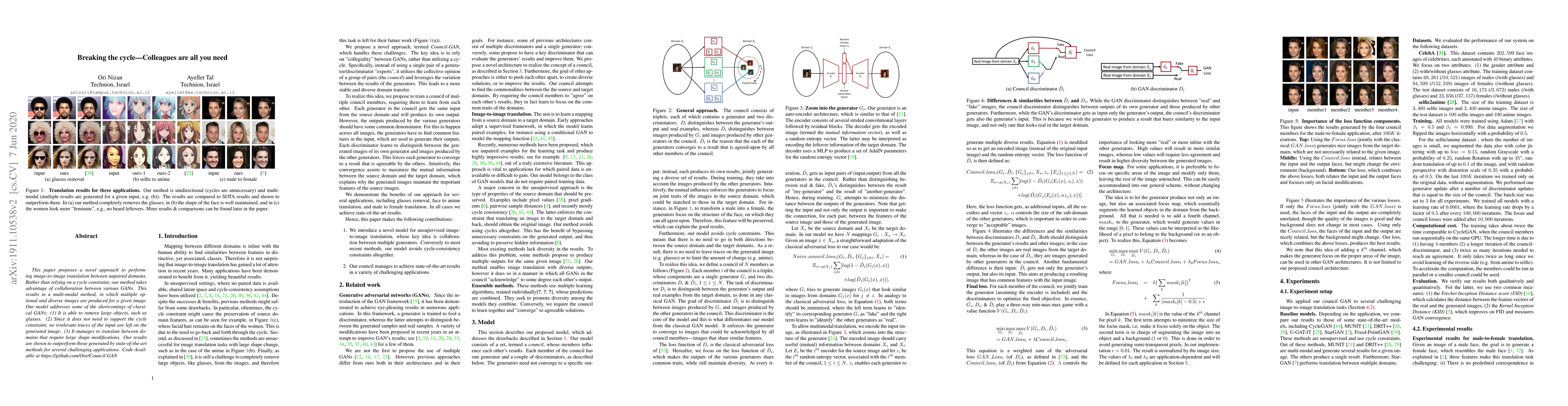 This paper proposes a novel approach to performing image-to-image translation between unpaired domains. Rather than relying on a cycle constraint, our method takes advantage of collaboration between various GANs. This results in a multi-modal method, in which multiple optional and diverse images are produced for a given image. Our model addresses some of the shortcomings of classical GANs: (1) It is able to remove large objects, such as glasses. (2) Since it does not need to support the cycle constraint, no irrelevant traces of the input are left on the generated image. (3) It manages to translate between domains that require large shape modifications. Our results are shown to outperform those generated by state-of-the-art methods for several challenging applications on commonly-used datasets, both qualitatively and quantitatively.