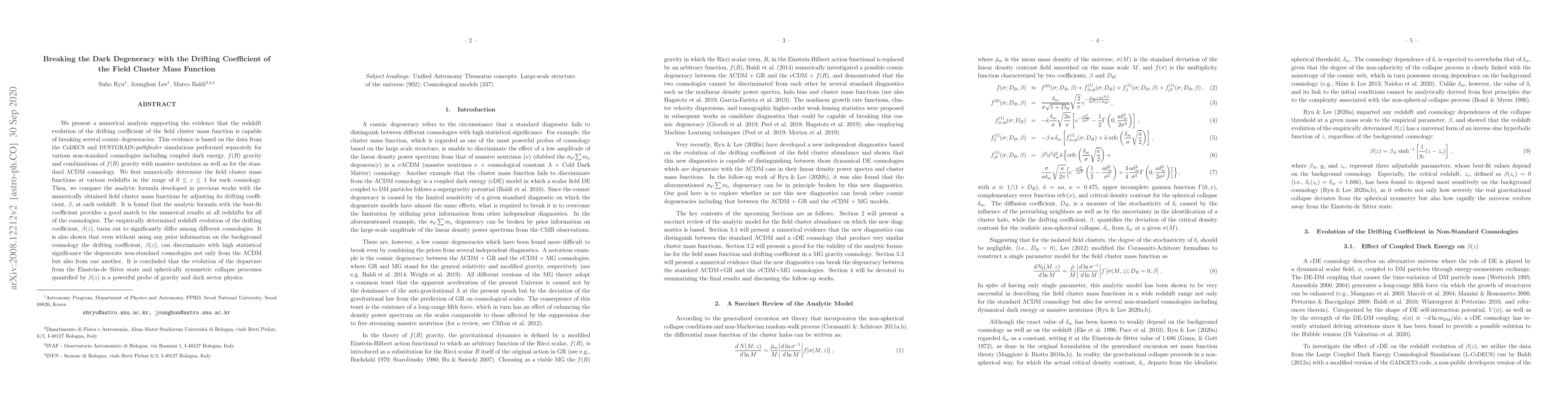 We present a numerical analysis supporting the evidence that the redshift evolution of the drifting coefficient of the field cluster mass function is capable of breaking several cosmic degeneracies. This evidence is based on the data from the CoDECS and DUSTGRAIN-pathfinder simulations performed separately for various non-standard cosmologies including coupled dark energy, $f(R)$ gravity and combinations of $f(R)$ gravity with massive neutrinos as well as for the standard $\Lambda$CDM cosmology. We first numerically determine the field cluster mass functions at various redshifts in the range of $0\le z\le 1$ for each cosmology. Then, we compare the analytic formula developed in previous works with the numerically obtained field cluster mass functions by adjusting its drifting coefficient, $\beta$, at each redshift. It is found that the analytic formula with the best-fit coefficient provides a good match to the numerical results at all redshifts for all of the cosmologies. The empirically determined redshift evolution of the drifting coefficient, $\beta(z)$, turns out to significantly differ among different cosmologies. It is also shown that even without using any prior information on the background cosmology the drifting coefficient, $\beta(z)$, can discriminate with high statistical significance the degenerate non-standard cosmologies not only from the $\Lambda$CDM but also from one another. It is concluded that the evolution of the departure from the Einstein-de Sitter state and spherically symmetric collapse processes quantified by $\beta(z)$ is a powerful probe of gravity and dark sector physics.