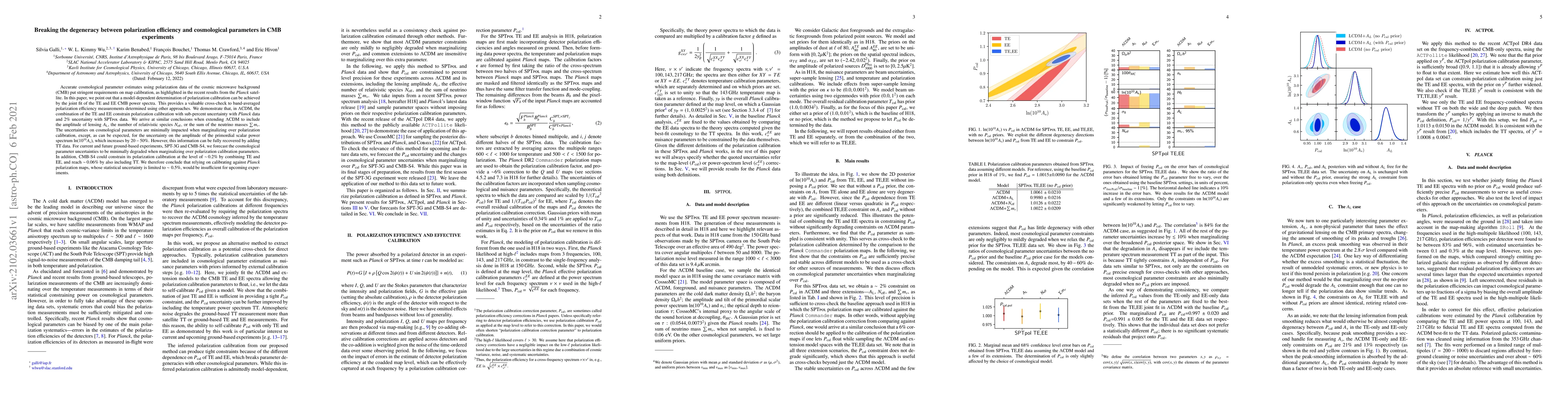 Accurate cosmological parameter estimates using polarization data of the cosmic microwave background (CMB) put stringent requirements on map calibration, as highlighted in the recent results from the Planck satellite. In this paper, we point out that a model-dependent determination of polarization calibration can be achieved by the joint fit of the TE and EE CMB power spectra. This provides a valuable cross-check to band-averaged polarization efficiency measurements determined using other approaches. We demonstrate that, in $\Lambda$CDM, the combination of the TE and EE constrain polarization calibration with sub-percent uncertainty with Planck data and 2% uncertainty with SPTpol data. We arrive at similar conclusions when extending $\Lambda$CDM to include the amplitude of lensing $A_{\rm L}$, the number of relativistic species $N_{\rm eff}$, or the sum of the neutrino masses $\sum m_{\nu}$. The uncertainties on cosmological parameters are minimally impacted when marginalizing over polarization calibration, except, as can be expected, for the uncertainty on the amplitude of the primordial scalar power spectrum $\ln(10^{10} A_{\rm s})$, which increases by $20-50$%. However, this information can be fully recovered by adding TT data. For current and future ground-based experiments, SPT-3G and CMB-S4, we forecast the cosmological parameter uncertainties to be minimally degraded when marginalizing over polarization calibration parameters. In addition, CMB-S4 could constrain its polarization calibration at the level of $\sim$0.2% by combining TE and EE, and reach $\sim$0.06% by also including TT. We therefore conclude that relying on calibrating against Planck polarization maps, whose statistical uncertainty is limited to $\sim$0.5%, would be insufficient for upcoming experiments.