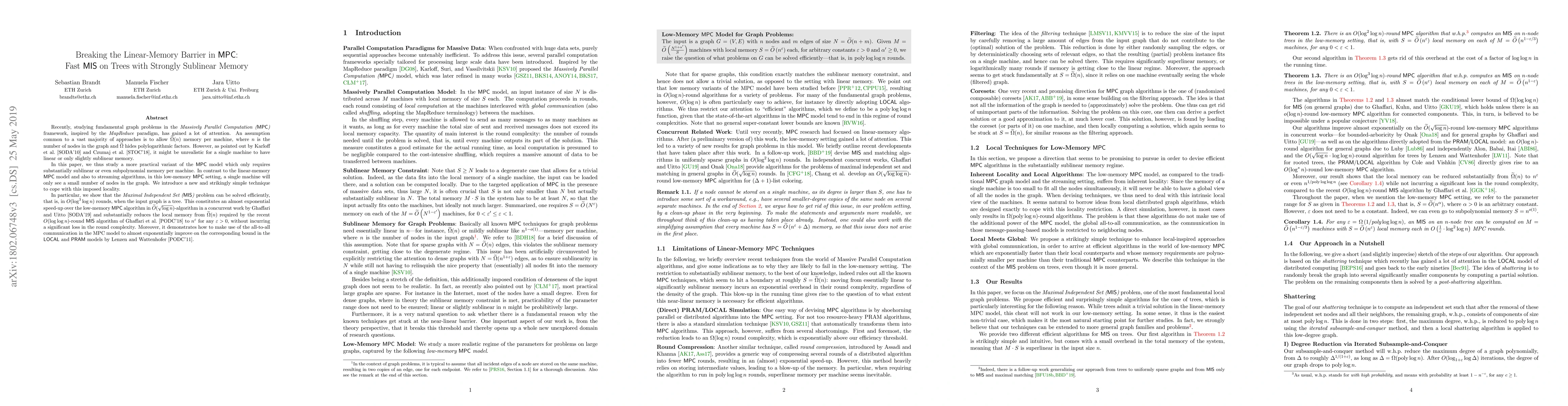 Recently, studying fundamental graph problems in the \emph{Massively Parallel Computation (MPC) framework, inspired by the MapReduce paradigm, has gained a lot of attention. An assumption common to a vast majority of approaches is to allow $\widetilde{\Omega}(n)$ memory per machine, where $n$ is the number of nodes in the graph and $\widetilde{\Omega}$ hides polylogarithmic factors. However, as pointed out by Karloff et al. [SODA'10] and Czumaj et al. [STOC'18], it might be unrealistic for a single machine to have linear or only slightly sublinear memory. In this paper, we thus study a more practical variant of the MPC model which only requires substantially sublinear or even subpolynomial memory per machine. In contrast to the linear-memory MPC model and also to streaming algorithms, in this low-memory MPC setting, a single machine will only see a small number of nodes in the graph. We introduce a new and strikingly simple technique to cope with this imposed locality. In particular, we show that the Maximal Independent Set (MIS) problem can be solved efficiently, that is, in $O(\log^3 \log n)$ rounds, when the input graph is a tree. This constitutes an almost exponential speed-up over the low-memory MPC algorithm in $O(\sqrt{\log n})$-algorithm in a concurrent work by Ghaffari and Uitto [SODA'19] and substantially reduces the local memory from $\widetilde{\Omega}(n)$ required by the recent $O(\log \log n)$-round MIS algorithm of Ghaffari et al. [PODC'18] to $n^{\alpha}$ for any $\alpha>0$, without incurring a significant loss in the round complexity. Moreover, it demonstrates how to make use of the all-to-all communication in the MPC model to almost exponentially improve on the corresponding bound in the $\mathsf{LOCAL}$ and $\mathsf{PRAM}$ models by Lenzen and Wattenhofer [PODC'11].