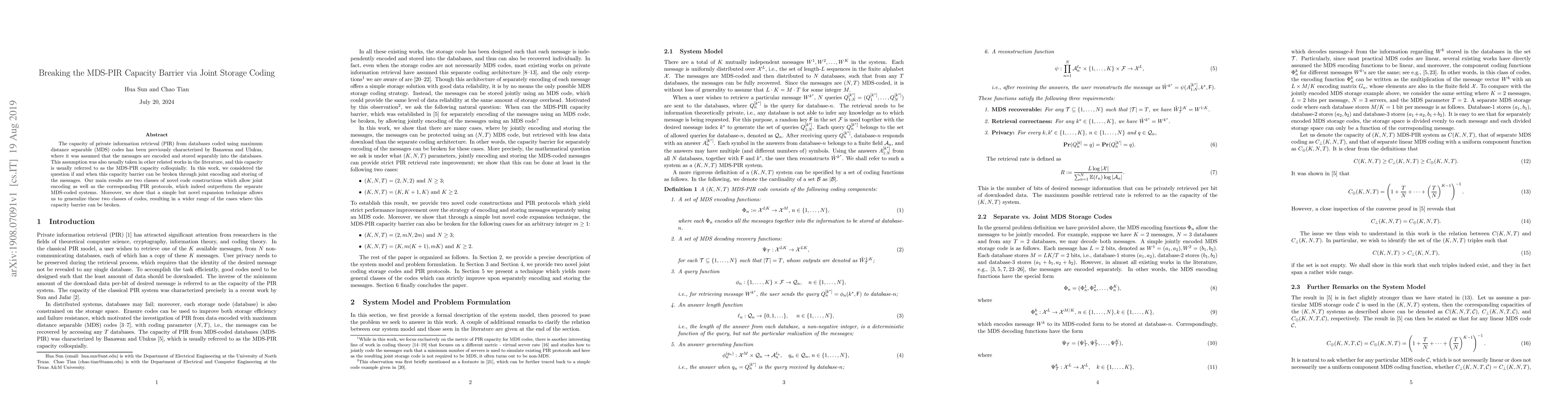 This work is different from existing research as it jointly encodes and stores messages using an MDS code, breaking the capacity barrier of separate coding MDS-PIR.