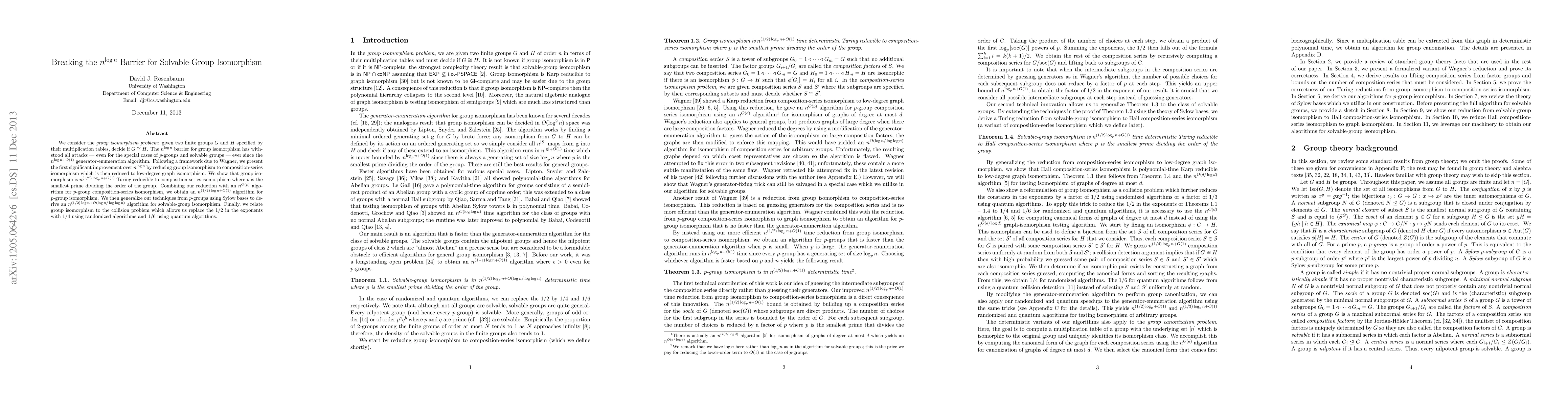This paper presents a significant improvement over the n^(log n) barrier for solving the group isomorphism problem, achieving an n^((1 / 2) log n + O(1)) algorithm for solvable-group isomorphism, leveraging reductions to composition-series isomorphism and advanced techniques for p-groups.
