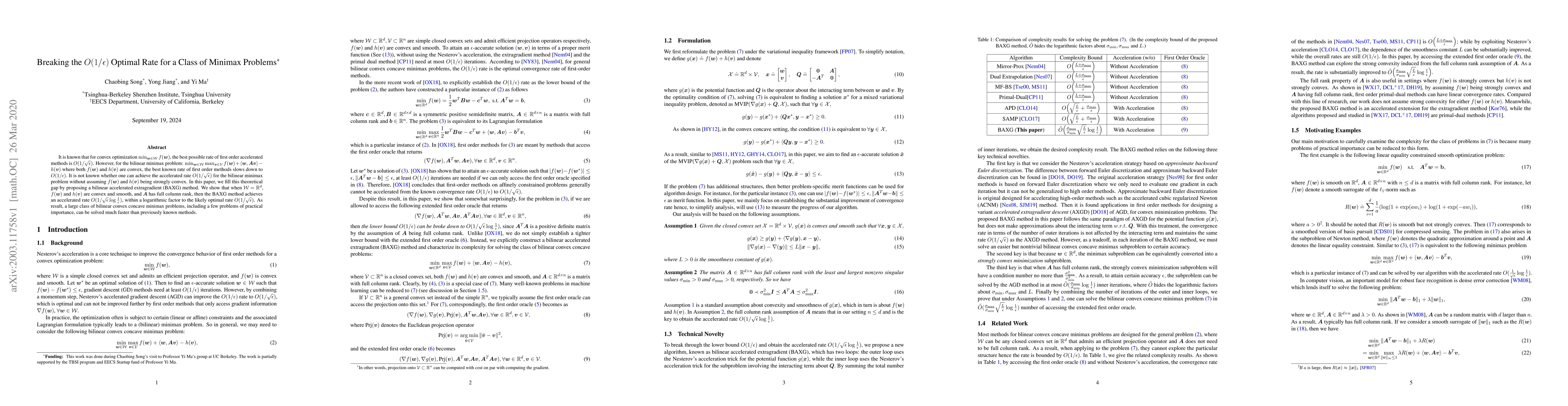 It is known that for convex optimization $\min_{\mathbf{w}\in\mathcal{W}}f(\mathbf{w})$, the best possible rate of first order accelerated methods is $O(1/\sqrt{\epsilon})$. However, for the bilinear minimax problem: $\min_{\mathbf{w}\in\mathcal{W}}\max_{\mathbf{v}\in\mathcal{V}}$ $f(\mathbf{w})$ $+\langle\mathbf{w}, \boldsymbol{A}\mathbf{v}\rangle$ $-h(\mathbf{v})$ where both $f(\mathbf{w})$ and $h(\mathbf{v})$ are convex, the best known rate of first order methods slows down to $O(1/{\epsilon})$. It is not known whether one can achieve the accelerated rate $O(1/\sqrt{\epsilon})$ for the bilinear minimax problem without assuming $f(\mathbf{w})$ and $h(\mathbf{v})$ being strongly convex. In this paper, we fill this theoretical gap by proposing a bilinear accelerated extragradient (BAXG) method. We show that when $\mathcal{W}=\mathbb{R}^d$, $f(\mathbf{w})$ and $h(\mathbf{v})$ are convex and smooth, and $\boldsymbol{A}$ has full column rank, then the BAXG method achieves an accelerated rate $O(1/\sqrt{\epsilon}\log \frac{1}{\epsilon})$, within a logarithmic factor to the likely optimal rate $O(1/\sqrt{\epsilon})$. As result, a large class of bilinear convex concave minimax problems, including a few problems of practical importance, can be solved much faster than previously known methods.