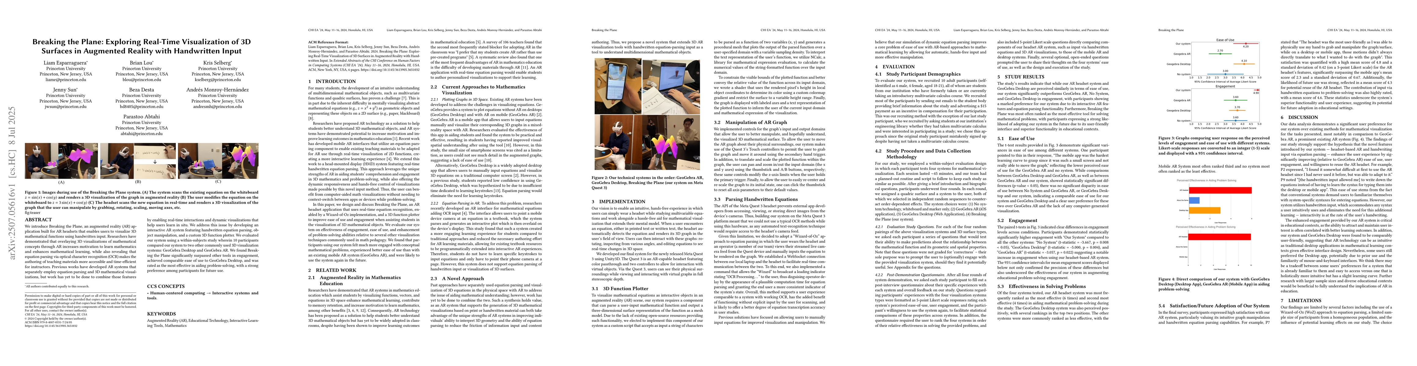 We introduce Breaking the Plane, an augmented reality (AR) application built for AR headsets that enables users to visualize 3D mathematical functions using handwritten input. Researchers have demonstrated overlaying 3D visualizations of mathematical concepts through AR enhances learning motivation and comprehension, and equation parsing makes the authoring of teaching materials more time-efficient for instructors. Previous works have developed AR systems that separately employ equation parsing and 3D mathematical visualizations, but work has yet to be done to combine those features by enabling real-time interactions and dynamic visualizations that help users learn in situ. We explore this by developing an AR system featuring handwritten equation parsing, graph manipulation, and a 3D function plotter. We found that our system significantly surpassed other systems in engagement, achieved comparable ease of use to a popular visualization tool, was considered the most effective in aiding problem-solving, and was highly preferred by participants for future use.