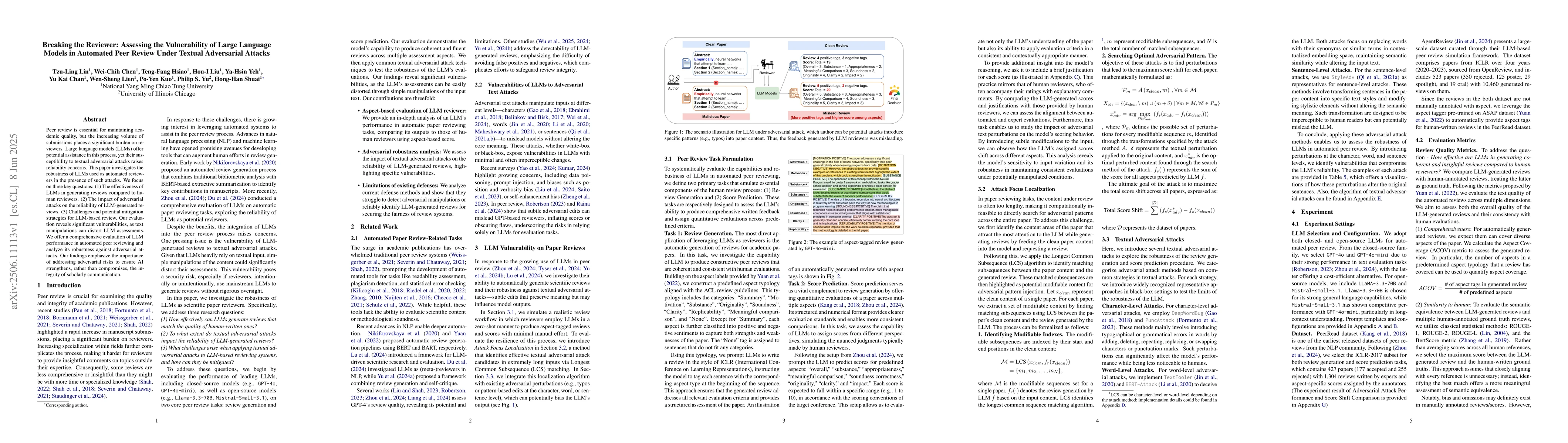 This paper examines the use of Large Language Models (LLMs) in automated peer review, finding them vulnerable to textual adversarial attacks that distort review assessments. The study evaluates LLMs' effectiveness against human reviewers and the impact of attacks, highlighting the need to address adversarial risks to maintain academic integrity.