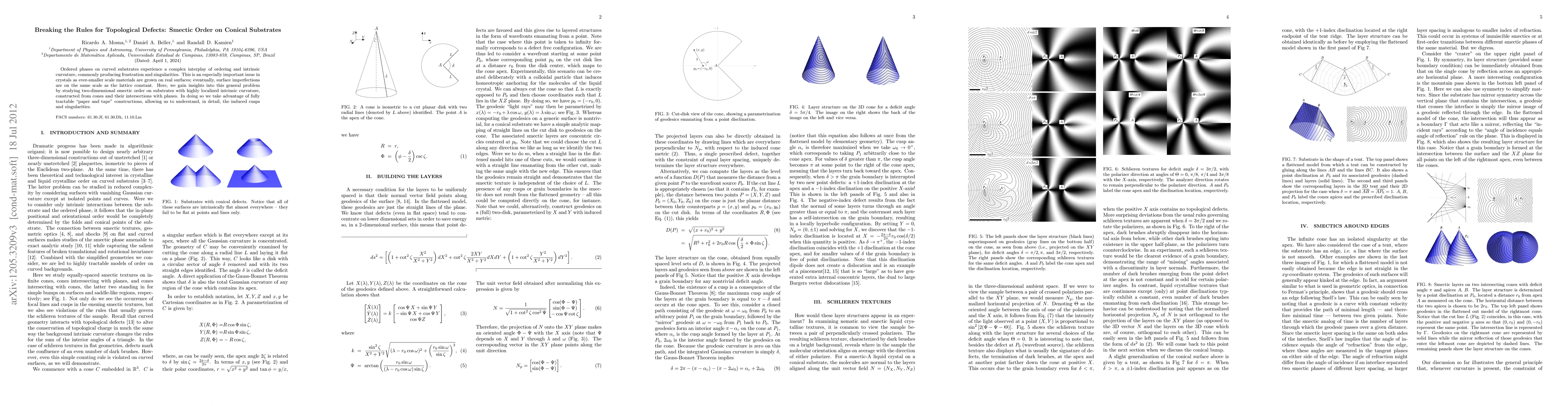 Ordered phases on curved substrates experience a complex interplay of ordering and intrinsic curvature, commonly producing frustration and singularities. This is an especially important issue in crystals as ever-smaller scale materials are grown on real surfaces; eventually, surface imperfections are on the same scale as the lattice constant. Here, we gain insights into this general problem by studying two-dimensional smectic order on substrates with highly localized intrinsic curvature, constructed from cones and their intersections with planes. In doing so we take advantage of fully tractable "paper and tape" constructions, allowing us to understand, in detail, the induced cusps and singularities.