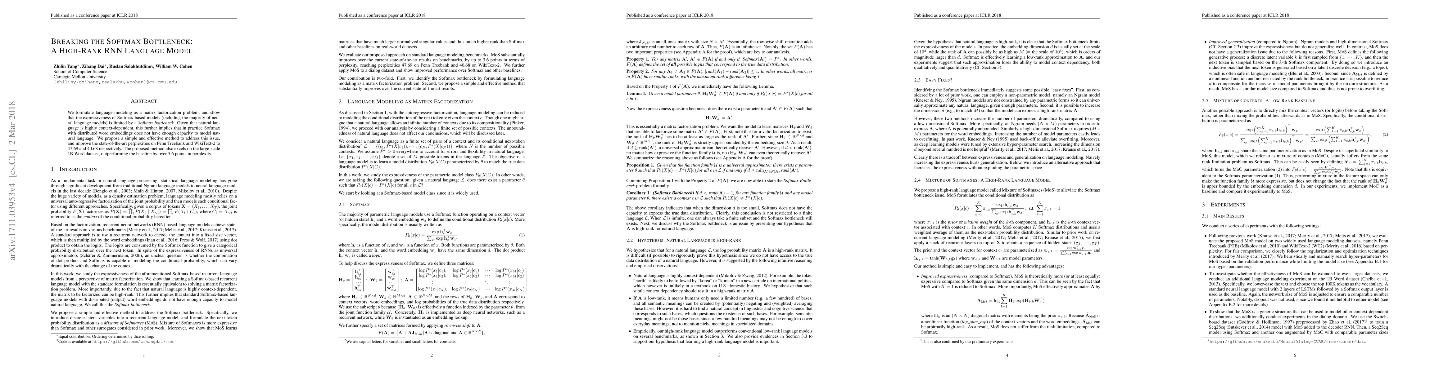 We formulate language modeling as a matrix factorization problem, and show that the expressiveness of Softmax-based models (including the majority of neural language models) is limited by a Softmax bottleneck. Given that natural language is highly context-dependent, this further implies that in practice Softmax with distributed word embeddings does not have enough capacity to model natural language. We propose a simple and effective method to address this issue, and improve the state-of-the-art perplexities on Penn Treebank and WikiText-2 to 47.69 and 40.68 respectively. The proposed method also excels on the large-scale 1B Word dataset, outperforming the baseline by over 5.6 points in perplexity.