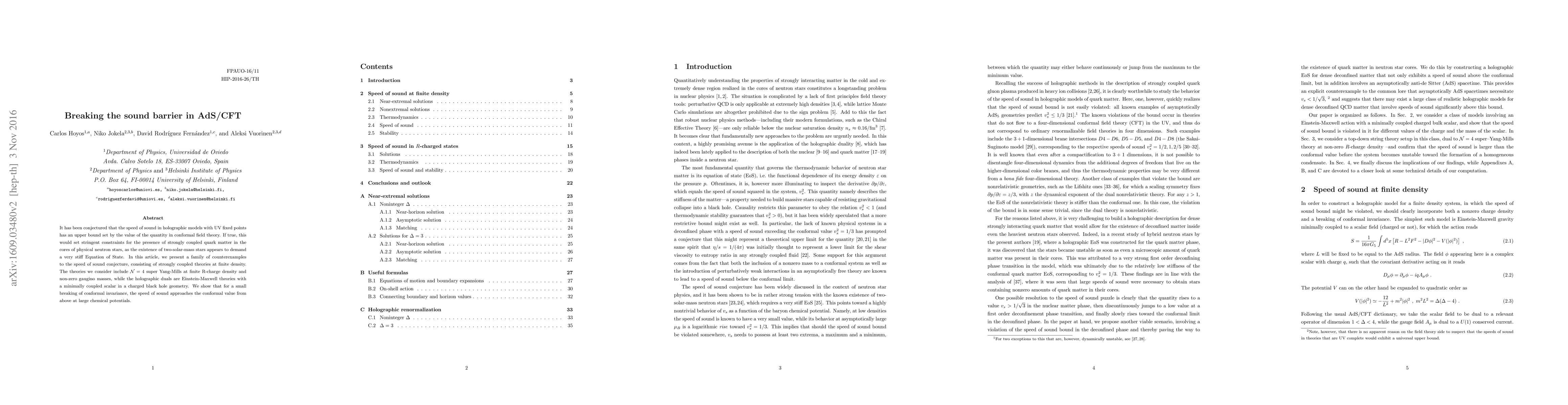 It has been conjectured that the speed of sound in holographic models with UV fixed points has an upper bound set by the value of the quantity in conformal field theory. If true, this would set stringent constraints for the presence of strongly coupled quark matter in the cores of physical neutron stars, as the existence of two-solar-mass stars appears to demand a very stiff Equation of State. In this article, we present a family of counterexamples to the speed of sound conjecture, consisting of strongly coupled theories at finite density. The theories we consider include ${\cal N}=4$ super Yang-Mills at finite R-charge density and non-zero gaugino masses, while the holographic duals are Einstein-Maxwell theories with a minimally coupled scalar in a charged black hole geometry. We show that for a small breaking of conformal invariance, the speed of sound approaches the conformal value from above at large chemical potentials.