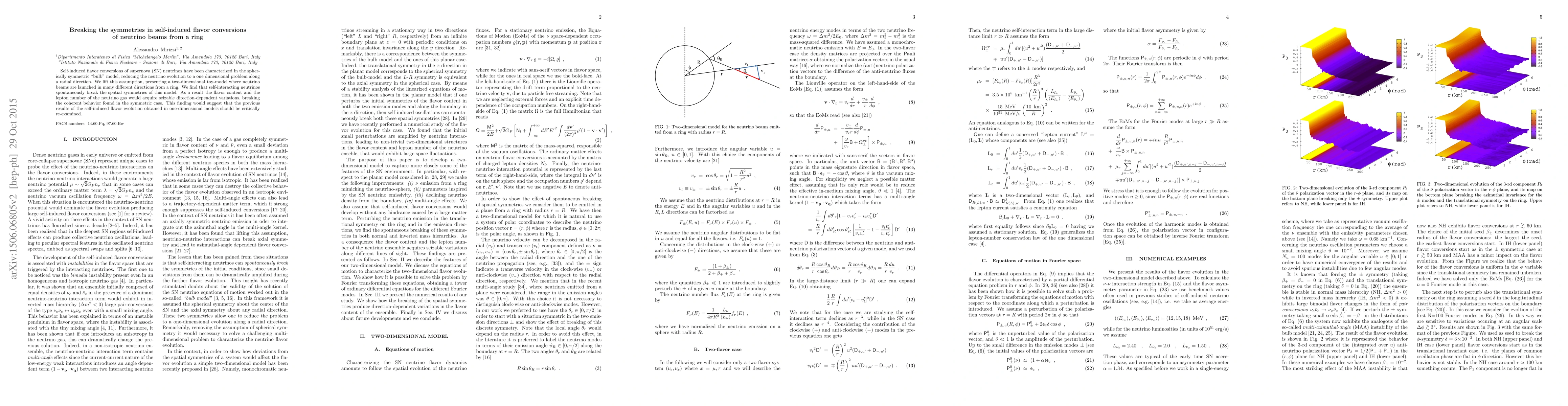 This paper investigates self-induced flavor conversions of supernova neutrinos using a two-dimensional model where neutrinos are emitted from a ring, revealing that self-interacting neutrinos break spatial symmetries, leading to direction-dependent variations in flavor content and lepton number, challenging previous one-dimensional results.