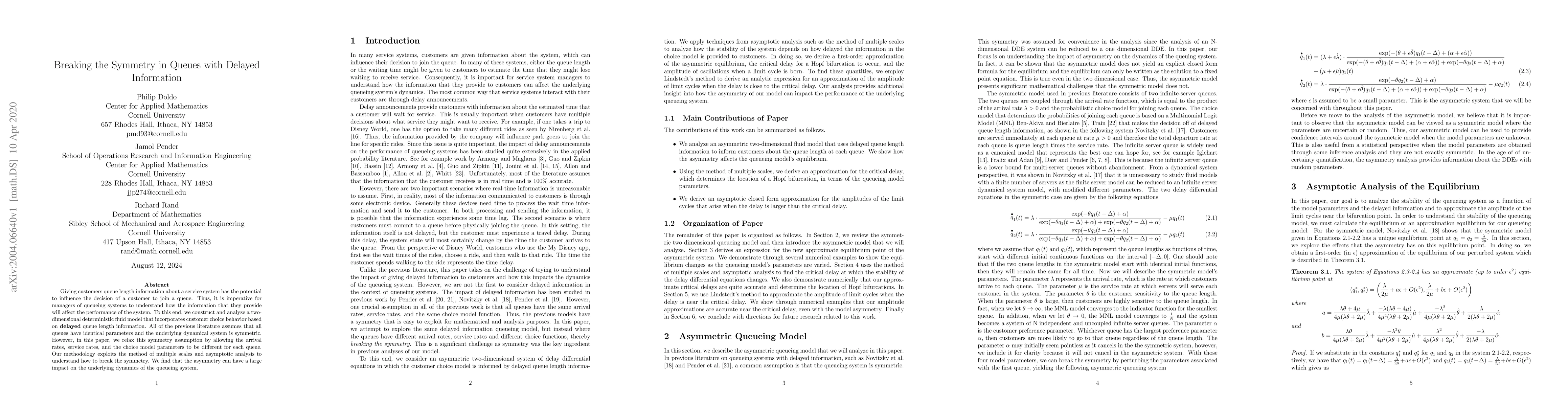 A new study breaks symmetry in queueing systems by analyzing customer choice behavior based on delayed queue length information. The findings suggest that asymmetry can significantly impact the system's dynamics.