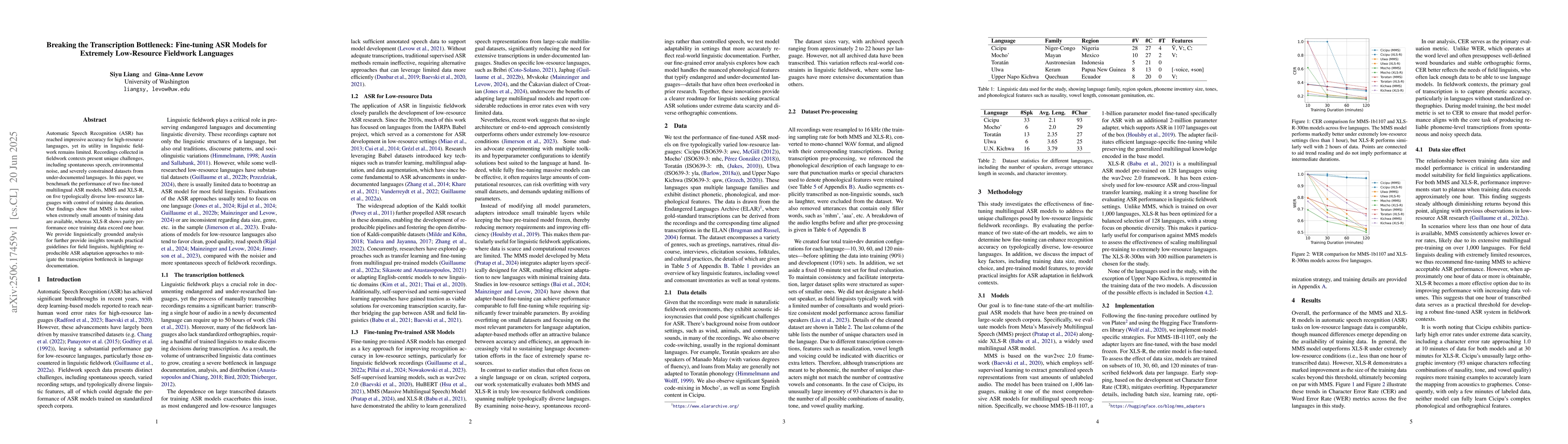 Automatic Speech Recognition (ASR) has reached impressive accuracy for high-resource languages, yet its utility in linguistic fieldwork remains limited. Recordings collected in fieldwork contexts present unique challenges, including spontaneous speech, environmental noise, and severely constrained datasets from under-documented languages. In this paper, we benchmark the performance of two fine-tuned multilingual ASR models, MMS and XLS-R, on five typologically diverse low-resource languages with control of training data duration. Our findings show that MMS is best suited when extremely small amounts of training data are available, whereas XLS-R shows parity performance once training data exceed one hour. We provide linguistically grounded analysis for further provide insights towards practical guidelines for field linguists, highlighting reproducible ASR adaptation approaches to mitigate the transcription bottleneck in language documentation.