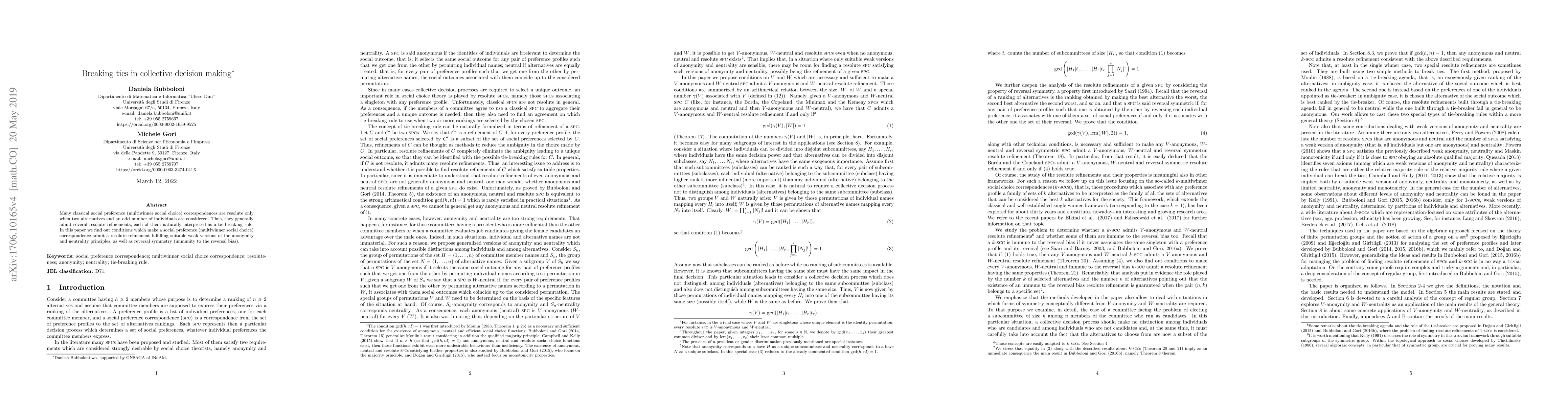 Many classical social preference (multiwinner social choice) correspondences are resolute only when two alternatives and an odd number of individuals are considered. Thus, they generally admit several resolute refinements, each of them naturally interpreted as a tie-breaking rule. In this paper we find out conditions which make a social preference (multiwinner social choice) correspondence admit a resolute refinement fulfilling suitable weak versions of the anonymity and neutrality principles, as well as reversal symmetry (immunity to the reversal bias).