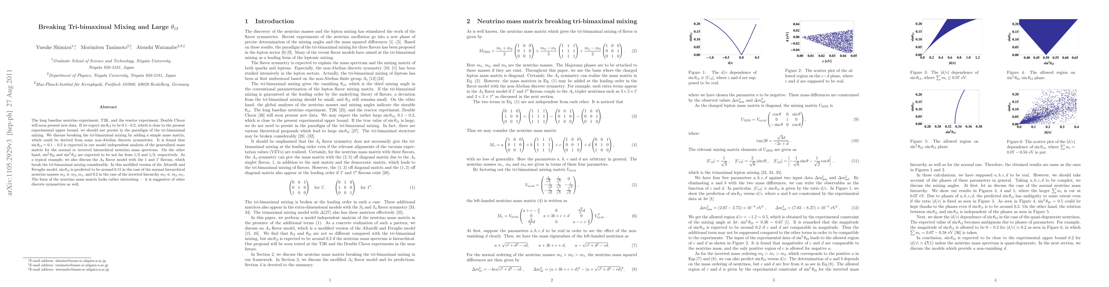 The paper introduces a method to break tri-bimaximal mixing using a generalized mass matrix derived from non-Abelian discrete symmetries, predicting specific values for neutrino mixing angles.