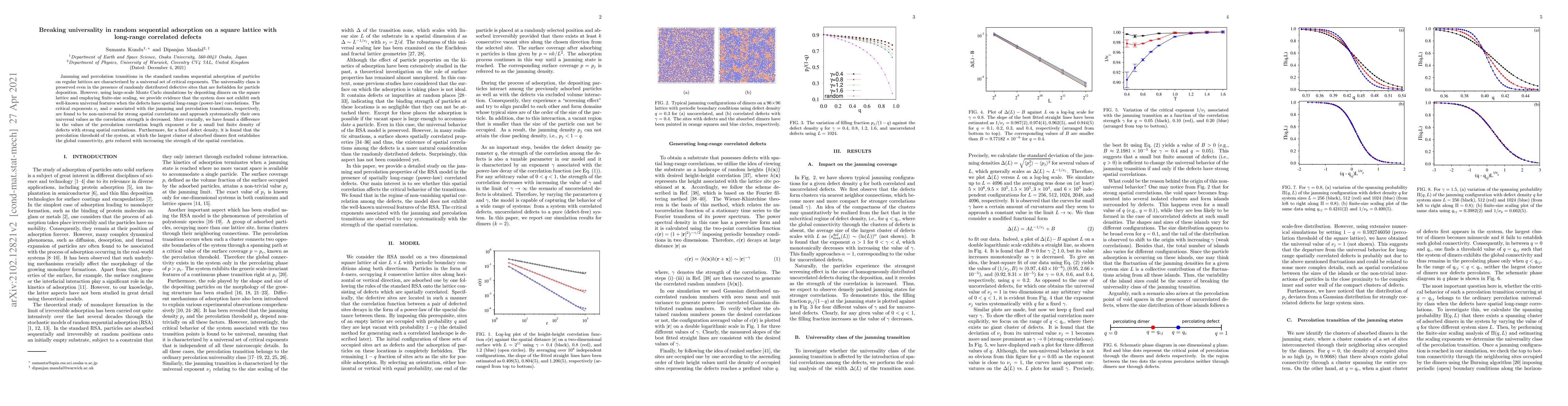 This study reveals that long-range correlated defects disrupt the universality of critical exponents in random sequential adsorption on a square lattice, showing non-universal values for jamming and percolation transitions. The percolation correlation length exponent $\nu$ varies with defect correlation strength, and the percolation threshold decreases with stronger spatial correlations.