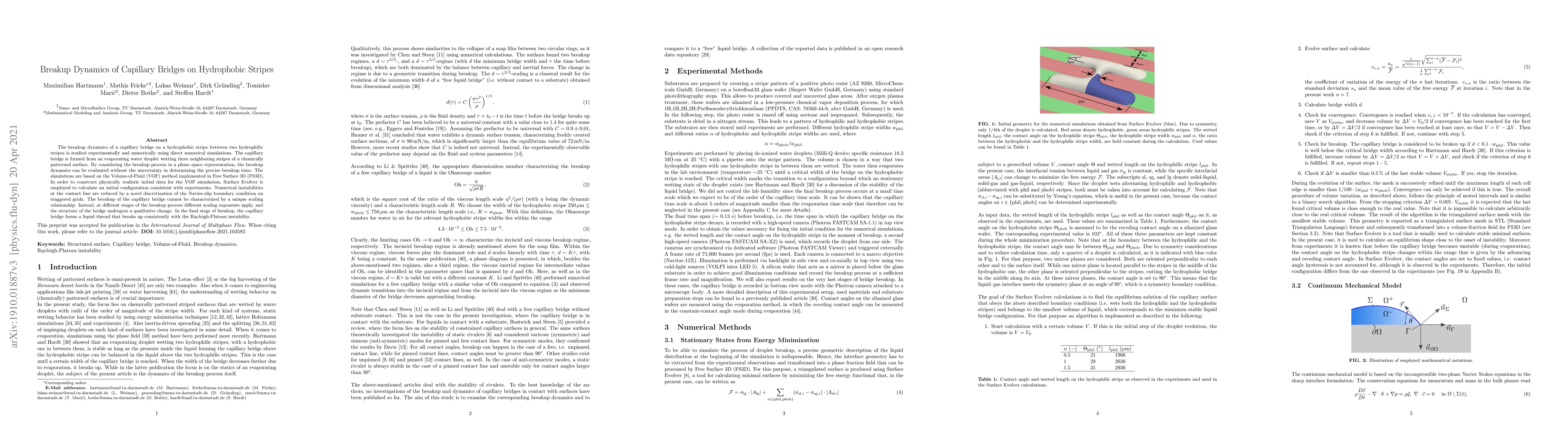 This paper investigates the breakup dynamics of capillary bridges on hydrophobic stripes using experimental and numerical simulations. The study reveals that the breakup process involves different scaling exponents at various stages, culminating in a liquid thread breakup governed by the Rayleigh-Plateau instability.