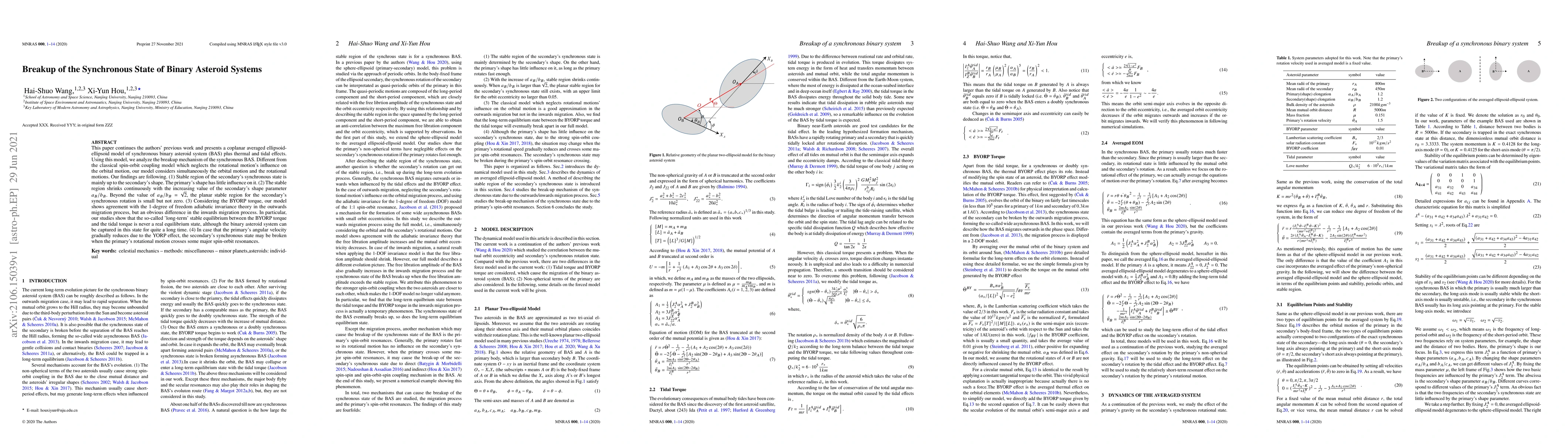 This research explores the breakup mechanisms of synchronous binary asteroid systems (BAS) using a coplanar averaged ellipsoid-ellipsoid model that incorporates thermal and tidal effects. The study reveals that the stability of the secondary's synchronous state primarily depends on its shape, with minimal influence from the primary's shape, and identifies specific conditions under which the synchronous state can break down due to spin-orbit resonances.