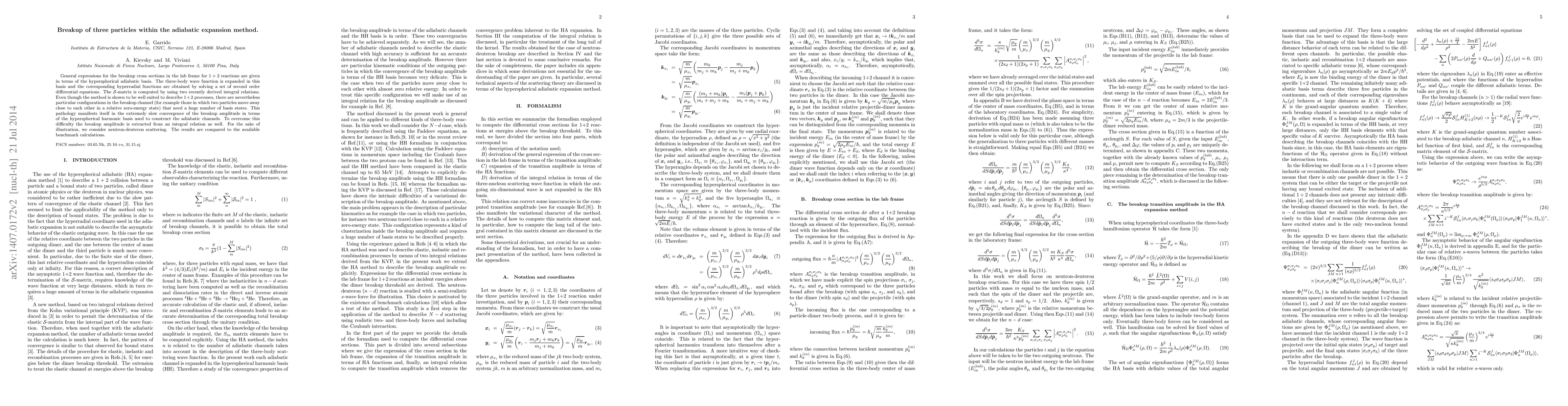 This paper presents a method for calculating breakup cross sections in $1+2$ reactions using the adiabatic expansion technique in the hyperspherical adiabatic basis. Despite its effectiveness, the method struggles with configurations requiring many basis states, leading to slow convergence, which is addressed by extracting the breakup amplitude from an integral relation.