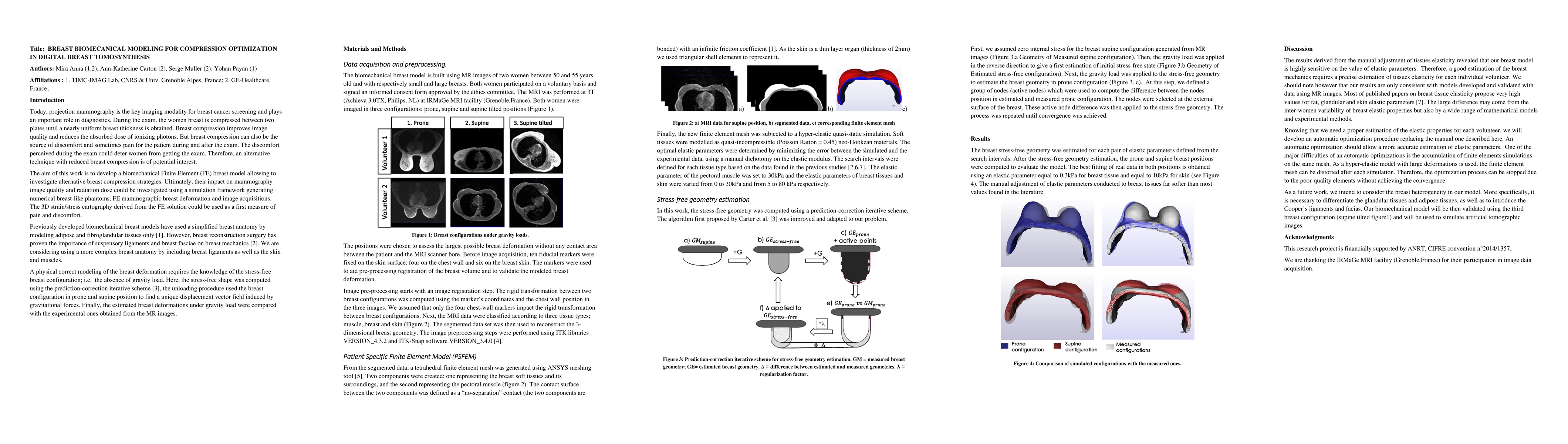 Mammography is a specific type of breast imaging that uses low-dose X-rays to detect cancer in early stage. During the exam, the women breast is compressed between two plates until a nearly uniform breast thickness is obtained. This technique improves image quality and reduces dose but can also be the source of discomfort and sometimes pain for the patient. Therefore, alternative techniques allowing reduced breast compression is of potential interest. The aim of this work is to develop a 3D biomechanical Finite Element (FE) breast model in order to analyze various breast compression strategies and their impact on image quality and radiation dose. Large breast deformations are simulated using this FE model with ANSYS software. A particular attention is granted to the computation of the residual stress in the model due to gravity and boundary conditions (thorax anatomy, position of the patient inside the MRI machine). Previously developed biomechanical breast models use a simplified breast anatomy by modeling adipose and fibroglandular tissues only (Rajagopal et al. in Wiley Interdiscip Rev: Syst Biol Med 2:293--304, 2010). However, breast reconstruction surgery has proven the importance of suspensory ligaments and breast fasciae on breast mechanics (Lockwood in Plast Reconstr Surg 103:1411--1420, 1999). We are therefore consider using a more realistic breast anatomy by including skin, muscles, and suspensory ligaments. The breast tissues are modeled as neo-Hookean materials. A physical correct modeling of the breast requires the knowledge of the stress-free breast configuration. Here, this undeformed shape (i.e., without any residual stress) is computed using the prediction--correction iterative scheme proposed by Eiben et al. (Ann of Biomed Eng 44:154--173, 2016). The unloading procedure uses the breast configuration in prone and supine position in order to find a unique displacement vector field induced by gravitational forces. The 3D breast geometry is reconstructed from MRI images that are segmented (Yushkevich et al. in Neuroimage 31:1116--1128, 2006) to differentiate the four main tissue types. The breast volume is discretized with a hexa-dominant FE meshing tool as a unique volume. Finally, the model is evaluated by comparing the estimated breast deformations under gravity load with the experimental ones measured in three body positions: prone, supine, and oblique supine.