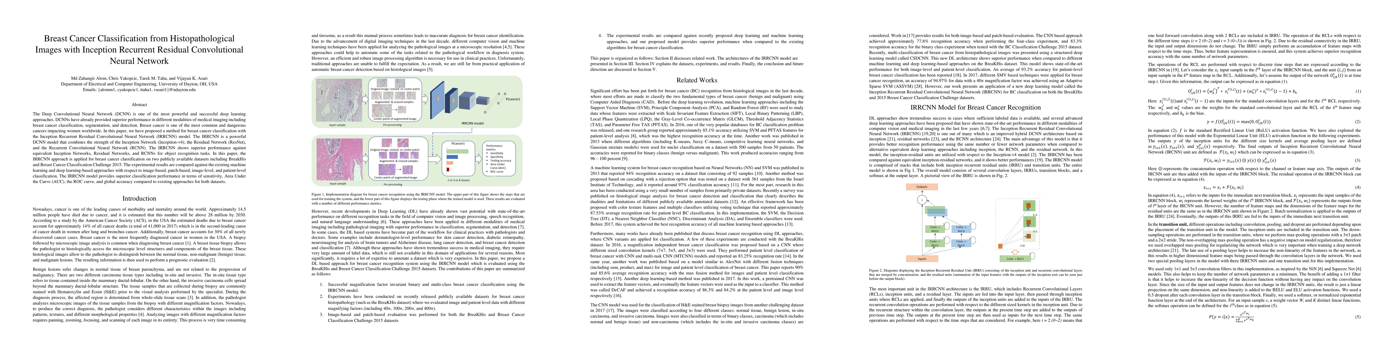This paper proposes an Inception Recurrent Residual Convolutional Neural Network (IRRCNN) for breast cancer classification from histopathological images. The IRRCNN model, combining Inception, ResNet, and RCNN, outperforms existing methods on BreakHis and Breast Cancer Classification Challenge datasets in terms of sensitivity, AUC, ROC curve, and accuracy.