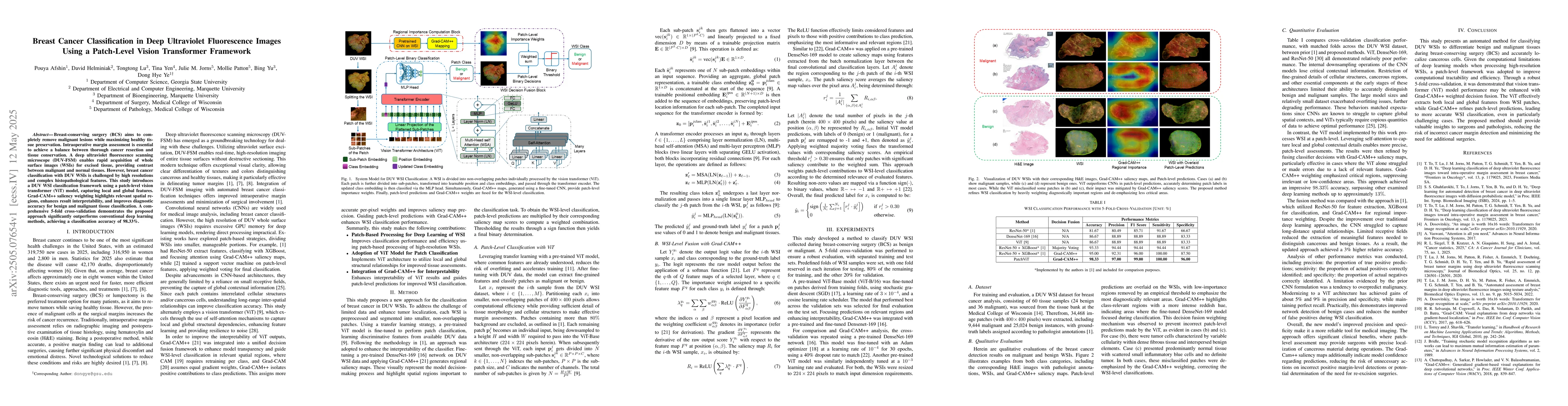 A new deep learning framework using patch-level vision transformer model improves breast cancer classification accuracy to 98.33% on DUV fluorescence images, outperforming conventional methods.