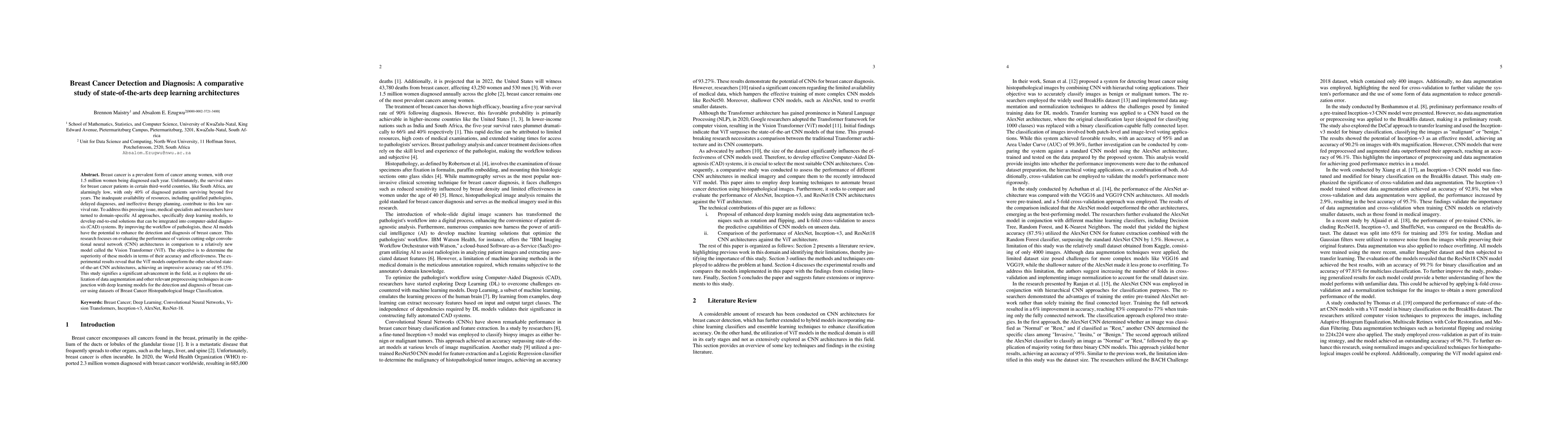 This study compares various state-of-the-art deep learning architectures, including convolutional neural networks (CNNs) and the Vision Transformer (ViT), for breast cancer detection and diagnosis. The ViT model was found to outperform other CNNs, achieving a superior accuracy rate of 95.15%, highlighting its potential to enhance pathologist workflows and improve survival rates in regions with limited medical resources.