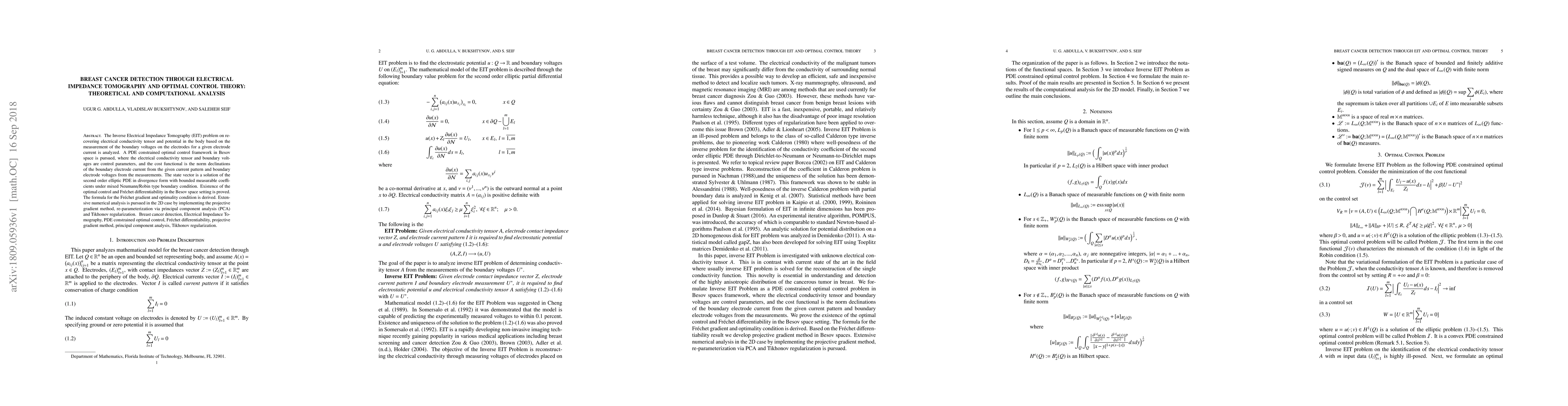 The Inverse Electrical Impedance Tomography (EIT) problem on recovering electrical conductivity tensor and potential in the body based on the measurement of the boundary voltages on the electrodes for a given electrode current is analyzed. A PDE constrained optimal control framework in Besov space is pursued, where the electrical conductivity tensor and boundary voltages are control parameters, and the cost functional is the norm declinations of the boundary electrode current from the given current pattern and boundary electrode voltages from the measurements. The state vector is a solution of the second order elliptic PDE in divergence form with bounded measurable coefficients under mixed Neumann/Robin type boundary condition. Existence of the optimal control and Fr\'echet differentiability in the Besov space setting is proved. The formula for the Fr\'echet gradient and optimality condition is derived. Extensive numerical analysis is pursued in the 2D case by implementing the projective gradient method, re-parameterization via principal component analysis (PCA) and Tikhonov regularization.