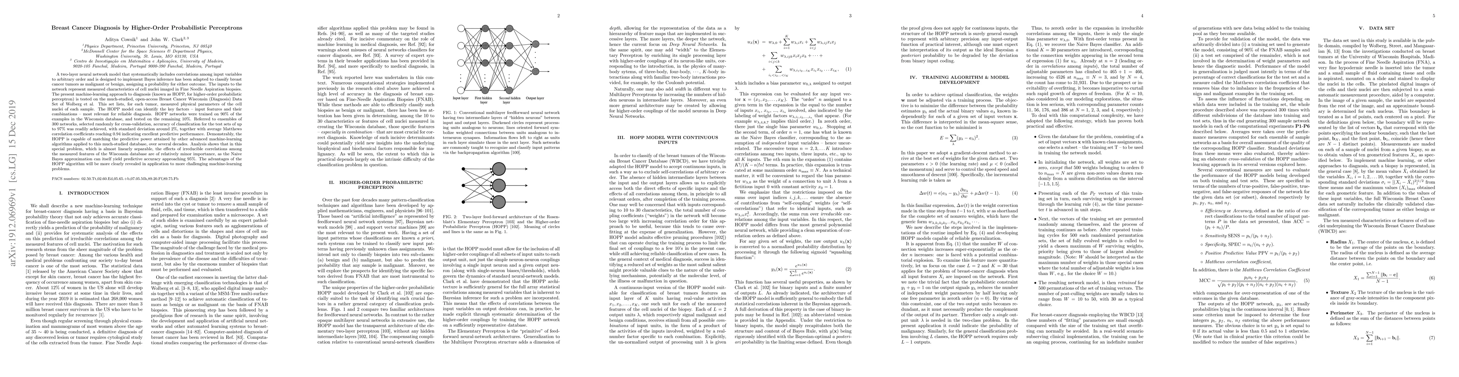 A two-layer neural network model that systematically includes correlations among input variables to arbitrary order and is designed to implement Bayes inference has been adapted to classify breast cancer tumors as malignant or benign, assigning a probability for either outcome. The inputs to the network represent measured characteristics of cell nuclei imaged in Fine Needle Aspiration biopsies. The present machine-learning approach to diagnosis (known as HOPP, for higher-order probabilistic perceptron) is tested on the much-studied, open-access Breast Cancer Wisconsin (Diagnosis) Data Set of Wolberg et al. This set lists, for each tumor, measured physical parameters of the cell nuclei of each sample. The HOPP model can identify the key factors -- input features and their combinations -- most relevant for reliable diagnosis. HOPP networks were trained on 90\% of the examples in the Wisconsin database, and tested on the remaining 10\%. Referred to ensembles of 300 networks, selected randomly for cross-validation, accuracy of classification for the test sets of up to 97\% was readily achieved, with standard deviation around 2\%, together with average Matthews correlation coefficients reaching 0.94 indicating excellent predictive performance. Demonstrably, the HOPP is capable of matching the predictive power attained by other advanced machine-learning algorithms applied to this much-studied database, over several decades. Analysis shows that in this special problem, which is almost linearly separable, the effects of irreducible correlations among the measured features of the Wisconsin database are of relatively minor importance, as the Naive Bayes approximation can itself yield predictive accuracy approaching 95\%. The advantages of the HOPP algorithm will be more clearly revealed in application to more challenging machine-learning problems.