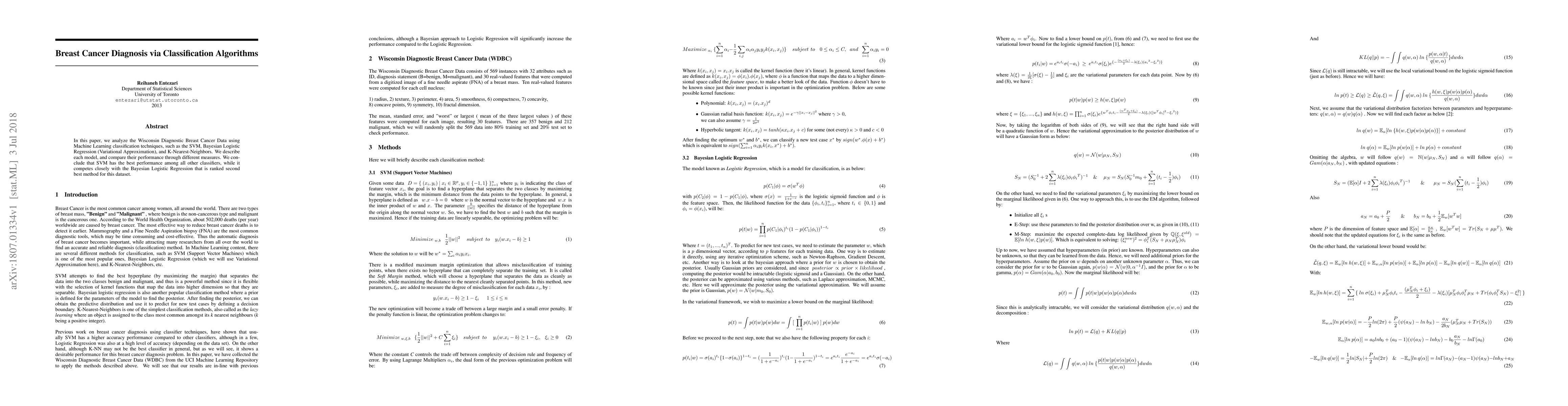 This paper evaluates the Wisconsin Diagnostic Breast Cancer Data using SVM, Bayesian Logistic Regression, and K-Nearest-Neighbors. The results show that SVM outperforms the other classifiers, with Bayesian Logistic Regression closely following.