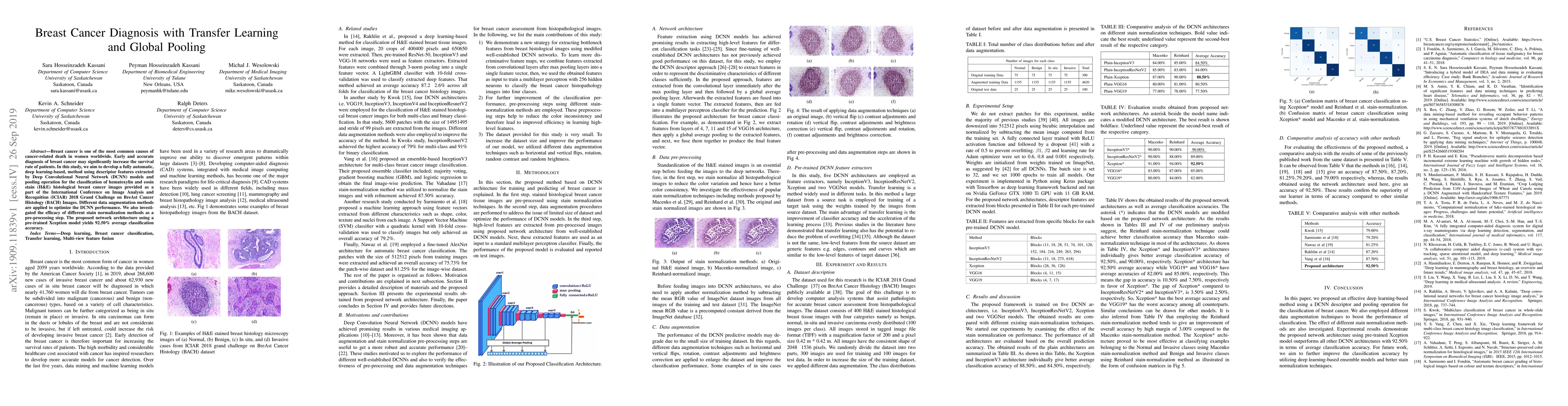 This paper proposes a deep learning method using transfer learning with a pre-trained Xception model and global pooling for the automatic classification of breast cancer in H&E stained histological images. The study achieves an average classification accuracy of 92.50% and explores various data augmentation and stain normalization techniques to optimize performance.