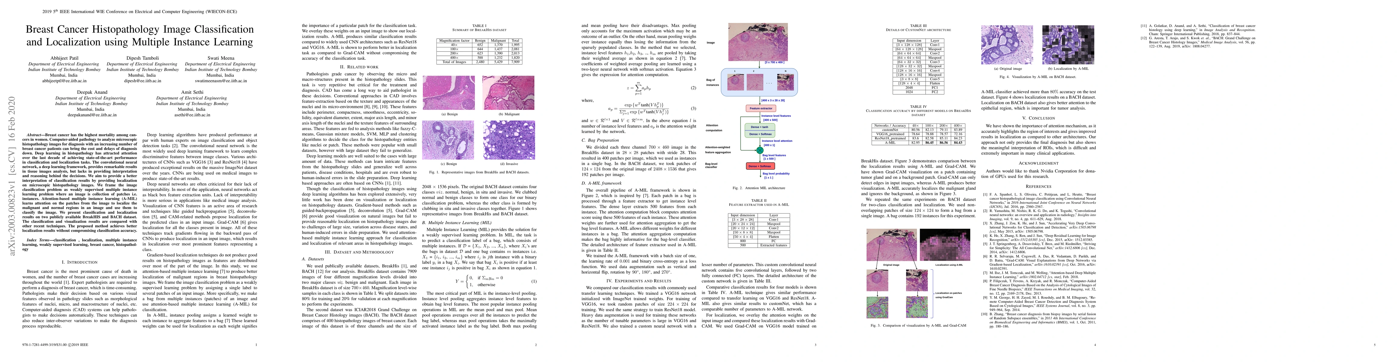 Breast cancer has the highest mortality among cancers in women. Computer-aided pathology to analyze microscopic histopathology images for diagnosis with an increasing number of breast cancer patients can bring the cost and delays of diagnosis down. Deep learning in histopathology has attracted attention over the last decade of achieving state-of-the-art performance in classification and localization tasks. The convolutional neural network, a deep learning framework, provides remarkable results in tissue images analysis, but lacks in providing interpretation and reasoning behind the decisions. We aim to provide a better interpretation of classification results by providing localization on microscopic histopathology images. We frame the image classification problem as weakly supervised multiple instance learning problem where an image is collection of patches i.e. instances. Attention-based multiple instance learning (A-MIL) learns attention on the patches from the image to localize the malignant and normal regions in an image and use them to classify the image. We present classification and localization results on two publicly available BreakHIS and BACH dataset. The classification and visualization results are compared with other recent techniques. The proposed method achieves better localization results without compromising classification accuracy.