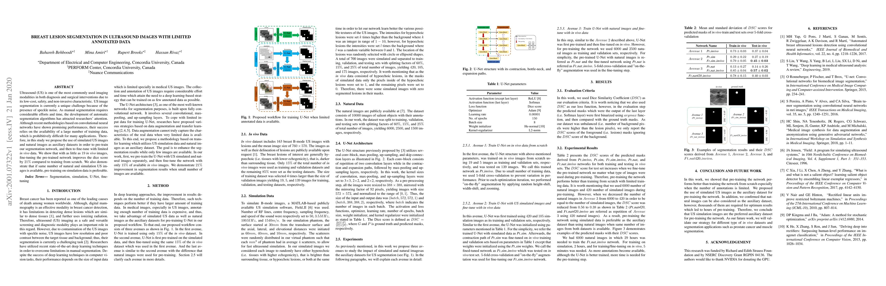 Ultrasound (US) is one of the most commonly used imaging modalities in both diagnosis and surgical interventions due to its low-cost, safety, and non-invasive characteristic. US image segmentation is currently a unique challenge because of the presence of speckle noise. As manual segmentation requires considerable efforts and time, the development of automatic segmentation algorithms has attracted researchers attention. Although recent methodologies based on convolutional neural networks have shown promising performances, their success relies on the availability of a large number of training data, which is prohibitively difficult for many applications. Therefore, in this study we propose the use of simulated US images and natural images as auxiliary datasets in order to pre-train our segmentation network, and then to fine-tune with limited in vivo data. We show that with as little as 19 in vivo images, fine-tuning the pre-trained network improves the dice score by 21% compared to training from scratch. We also demonstrate that if the same number of natural and simulation US images is available, pre-training on simulation data is preferable.