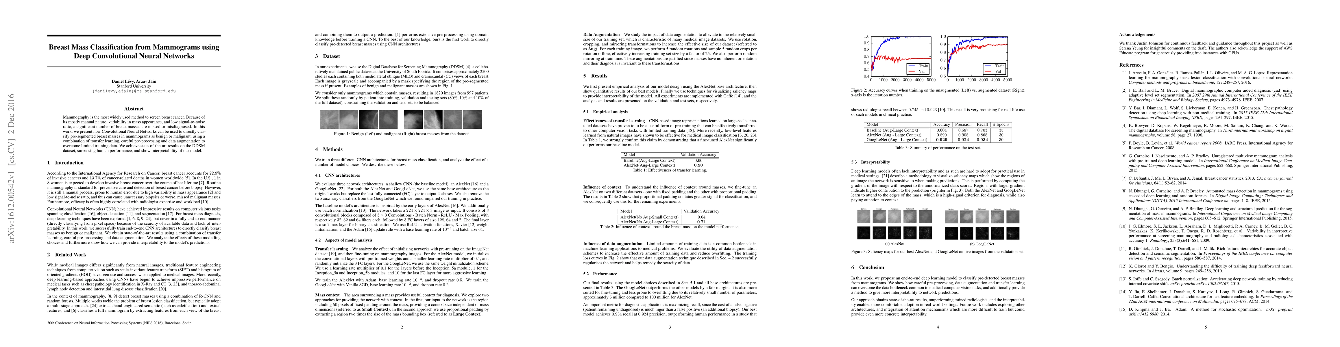 Mammography is the most widely used method to screen breast cancer. Because of its mostly manual nature, variability in mass appearance, and low signal-to-noise ratio, a significant number of breast masses are missed or misdiagnosed. In this work, we present how Convolutional Neural Networks can be used to directly classify pre-segmented breast masses in mammograms as benign or malignant, using a combination of transfer learning, careful pre-processing and data augmentation to overcome limited training data. We achieve state-of-the-art results on the DDSM dataset, surpassing human performance, and show interpretability of our model.