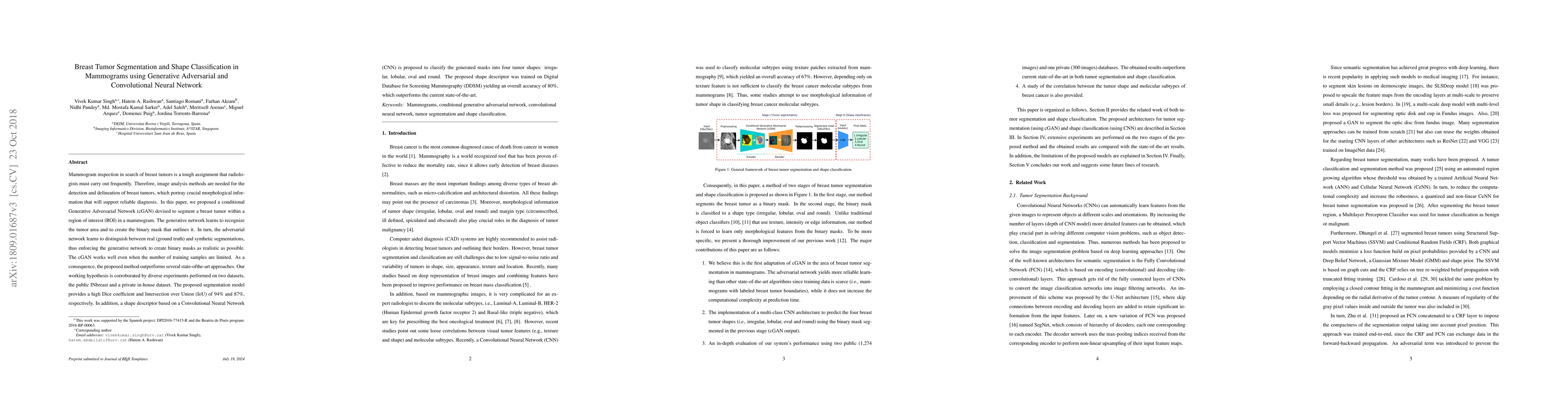 The paper introduces a novel conditional Generative Adversarial Network (cGAN) for breast tumor segmentation and a CNN-based shape descriptor for classification, demonstrating improved performance compared to existing methods.