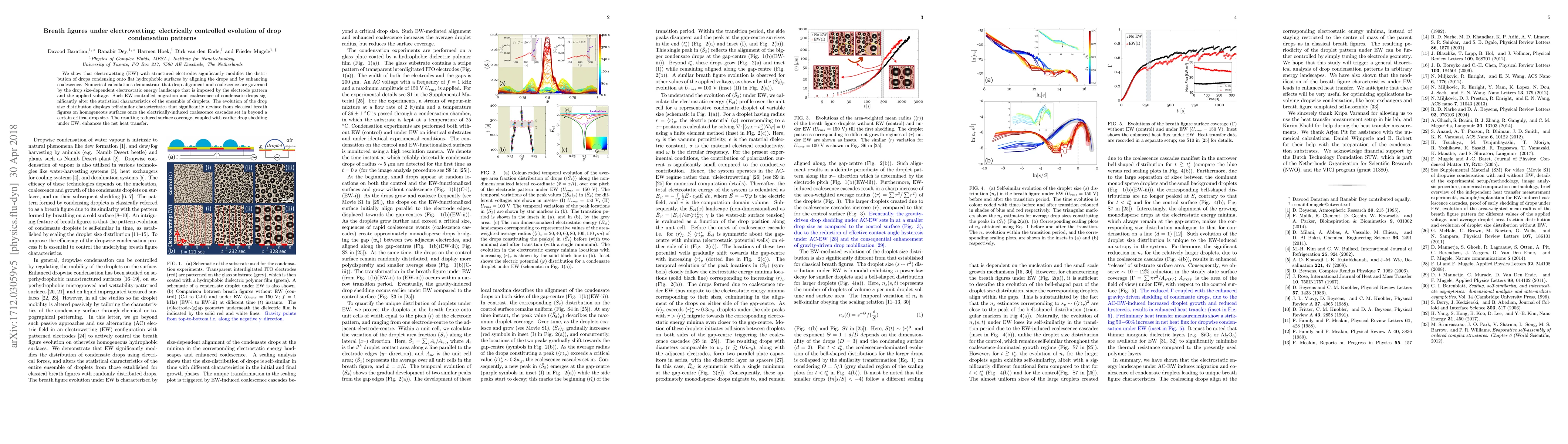 We show that electrowetting (EW) with structured electrodes significantly modifies the distribution of drops condensing onto flat hydrophobic surfaces by aligning the drops and by enhancing coalescence. Numerical calculations demonstrate that drop alignment and coalescence are governed by the drop size-dependent electrostatic energy landscape that is imposed by the electrode pattern and the applied voltage. Such EW-controlled migration and coalescence of condensate drops significantly alter the statistical characteristics of the ensemble of droplets. The evolution of the drop size distribution displays self-similar characteristics that significantly deviate from classical breath figures on homogeneous surfaces once the electrically-induced coalescence cascades set in beyond a certain critical drop size. The resulting reduced surface coverage, coupled with earlier drop shedding under EW, enhances the net heat transfer.