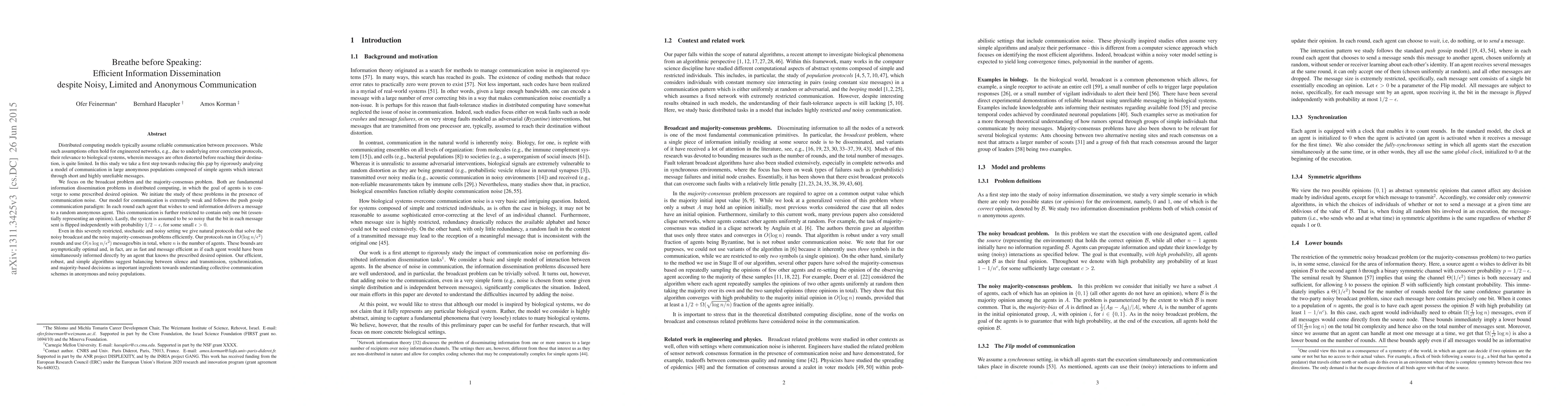 Distributed computing models typically assume reliable communication between processors. While such assumptions often hold for engineered networks, e.g., due to underlying error correction protocols, their relevance to biological systems, wherein messages are often distorted before reaching their destination, is quite limited. In this study we take a first step towards reducing this gap by rigorously analyzing a model of communication in large anonymous populations composed of simple agents which interact through short and highly unreliable messages. We focus on the broadcast problem and the majority-consensus problem. Both are fundamental information dissemination problems in distributed computing, in which the goal of agents is to converge to some prescribed desired opinion. We initiate the study of these problems in the presence of communication noise. Our model for communication is extremely weak and follows the push gossip communication paradigm: In each round each agent that wishes to send information delivers a message to a random anonymous agent. This communication is further restricted to contain only one bit (essentially representing an opinion). Lastly, the system is assumed to be so noisy that the bit in each message sent is flipped independently with probability $1/2-\epsilon$, for some small $\epsilon >0$. Even in this severely restricted, stochastic and noisy setting we give natural protocols that solve the noisy broadcast and the noisy majority-consensus problems efficiently. Our protocols run in $O(\log n / \epsilon^2)$ rounds and use $O(n \log n / \epsilon^2)$ messages/bits in total, where $n$ is the number of agents. These bounds are asymptotically optimal and, in fact, are as fast and message efficient as if each agent would have been simultaneously informed directly by an agent that knows the prescribed desired opinion.