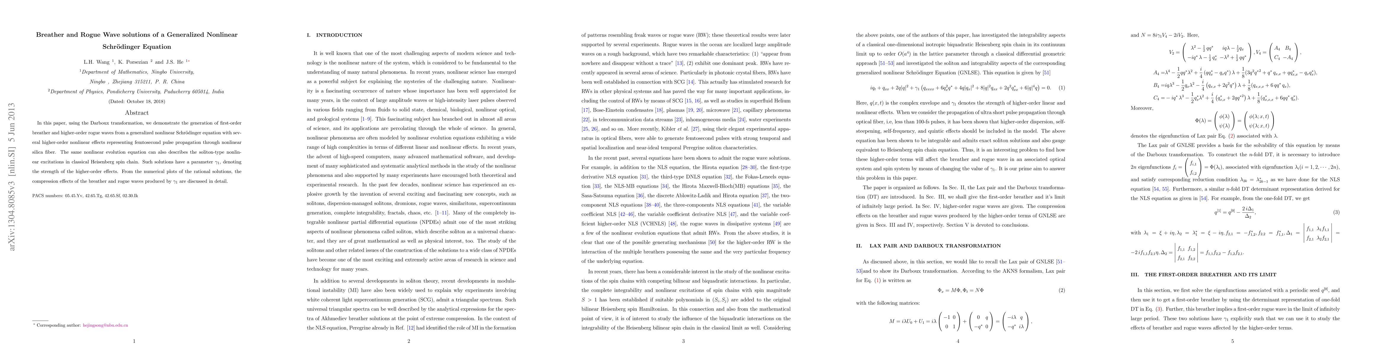 This paper utilizes the Darboux transformation to generate first-order breathers and higher-order rogue waves from a generalized nonlinear Schrödinger equation, modeling femtosecond pulse propagation in nonlinear silica fiber and soliton excitations in the classical Heisenberg spin chain. The solutions' compression effects due to the parameter $\gamma_1$ are analyzed through numerical plots.