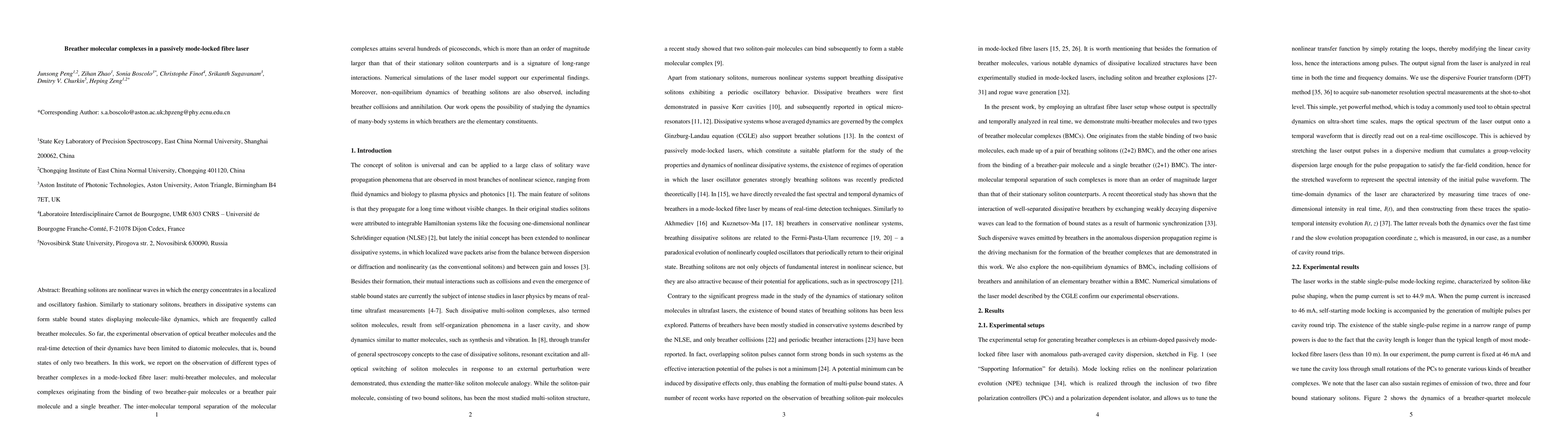 Breathing solitons are nonlinear waves in which the energy concentrates in a localized and oscillatory fashion. Similarly to stationary solitons, breathers in dissipative systems can form stable bound states displaying molecule-like dynamics, which are frequently called breather molecules. So far, the experimental observation of optical breather molecules and the real-time detection of their dynamics have been limited to diatomic molecules, that is, bound states of only two breathers. In this work, we report on the observation of different types of breather complexes in a mode-locked fibre laser: multi-breather molecules, and molecular complexes originating from the binding of two breather-pair molecules or a breather pair molecule and a single breather. The inter-molecular temporal separation of the molecular complexes attains several hundreds of picoseconds, which is more than an order of magnitude larger than that of their stationary soliton counterparts and is a signature of long-range interactions. Numerical simulations of the laser model support our experimental findings. Moreover, non-equilibrium dynamics of breathing solitons are also observed, including breather collisions and annihilation. Our work opens the possibility of studying the dynamics of many-body systems in which breathers are the elementary constituents.