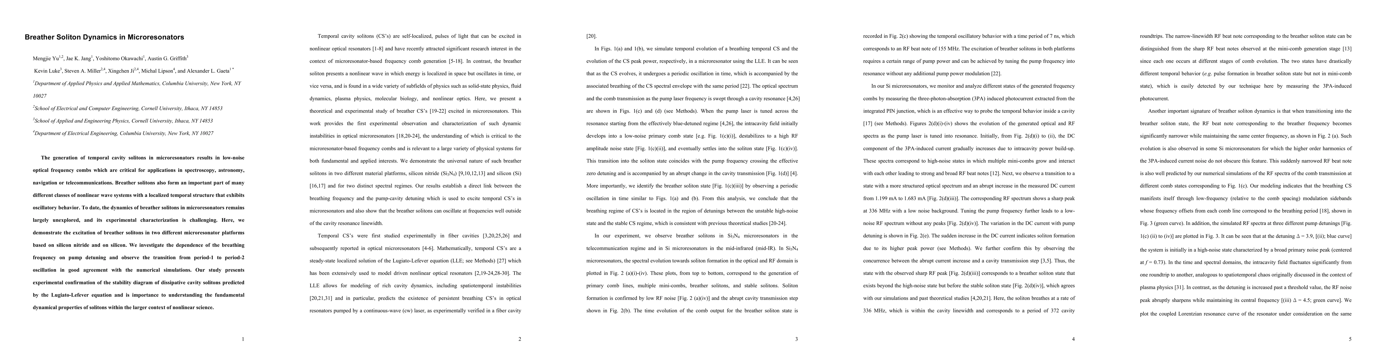 This research demonstrates the generation of breather solitons in silicon nitride and silicon microresonators, exploring their dynamic behavior and confirming theoretical predictions for their stability. The study reveals a transition from period-1 to period-2 oscillations as a function of pump detuning, contributing to the understanding of soliton dynamics in nonlinear wave systems.