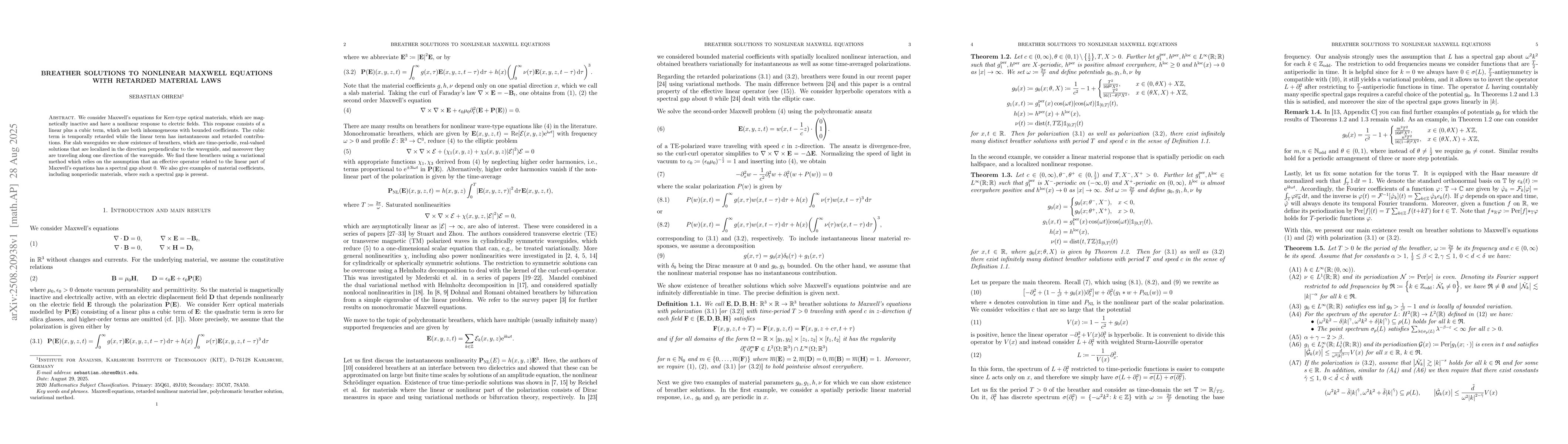 We consider Maxwell's equations for Kerr-type optical materials, which are magnetically inactive and have a nonlinear response to electric fields. This response consists of a linear plus a cubic term, which are both inhomogeneous with bounded coefficients. The cubic term is temporally retarded while the linear term has instantaneous and retarded contributions. For slab waveguides we show existence of breathers, which are time-periodic, real-valued solutions that are localized in the direction perpendicular to the waveguide, and moreover they are traveling along one direction of the waveguide. We find these breathers using a variational method which relies on the assumption that an effective operator related to the linear part of Maxwell's equations has a spectral gap about $0$. We also give examples of material coefficients, including nonperiodic materials, where such a spectral gap is present.