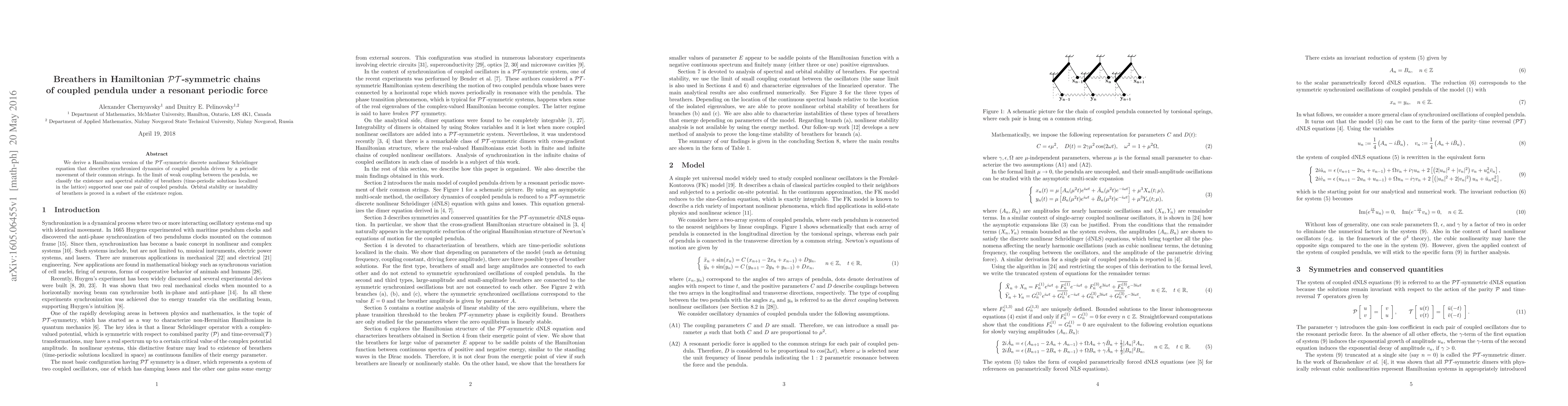 We derive a Hamiltonian version of the ${\cal PT}$-symmetric discrete nonlinear Schr\"{o}dinger equation that describes synchronized dynamics of coupled pendula driven by a periodic movement of their common strings. In the limit of weak coupling between the pendula, we classify the existence and spectral stability of breathers (time-periodic solutions localized in the lattice) supported near one pair of coupled pendula. Orbital stability or instability of breathers is proved in a subset of the existence region.