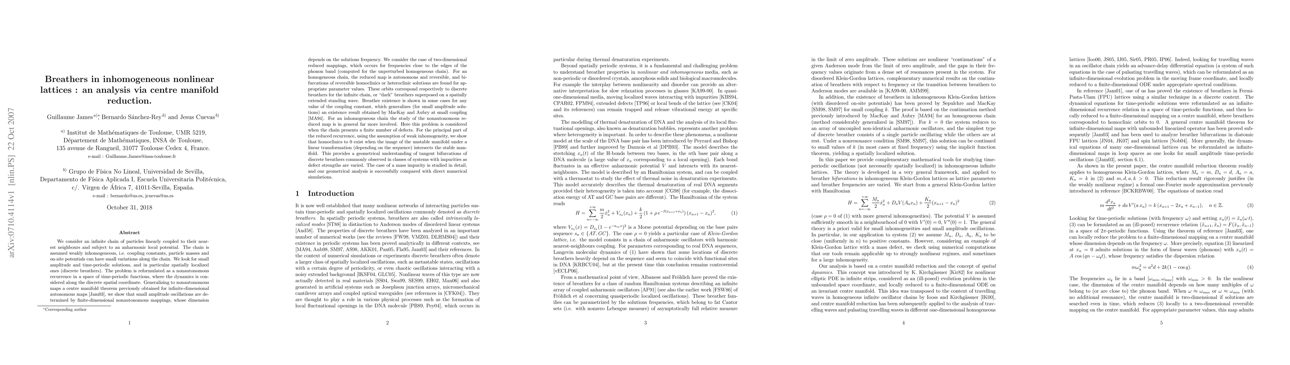 We consider an infinite chain of particles linearly coupled to their nearest neighbours and subject to an anharmonic local potential. The chain is assumed weakly inhomogeneous. We look for small amplitude discrete breathers. The problem is reformulated as a nonautonomous recurrence in a space of time-periodic functions, where the dynamics is considered along the discrete spatial coordinate. We show that small amplitude oscillations are determined by finite-dimensional nonautonomous mappings, whose dimension depends on the solutions frequency. We consider the case of two-dimensional reduced mappings, which occurs for frequencies close to the edges of the phonon band. For an homogeneous chain, the reduced map is autonomous and reversible, and bifurcations of reversible homoclinics or heteroclinic solutions are found for appropriate parameter values. These orbits correspond respectively to discrete breathers, or dark breathers superposed on a spatially extended standing wave. Breather existence is shown in some cases for any value of the coupling constant, which generalizes an existence result obtained by MacKay and Aubry at small coupling. For an inhomogeneous chain the study of the nonautonomous reduced map is in general far more involved. For the principal part of the reduced recurrence, using the assumption of weak inhomogeneity, we show that homoclinics to 0 exist when the image of the unstable manifold under a linear transformation intersects the stable manifold. This provides a geometrical understanding of tangent bifurcations of discrete breathers. The case of a mass impurity is studied in detail, and our geometrical analysis is successfully compared with direct numerical simulations.