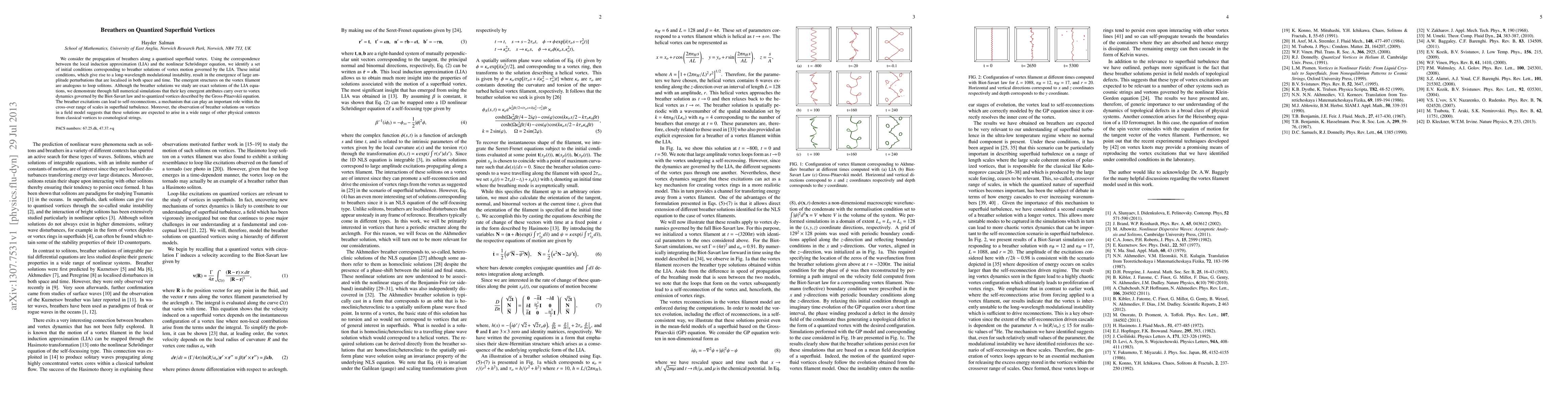 Researchers discovered breather solutions on quantized superfluid vortices that lead to large amplitude perturbations and self-reconnections in turbulence, with implications for understanding superfluid dynamics and potential applications to other physical contexts.