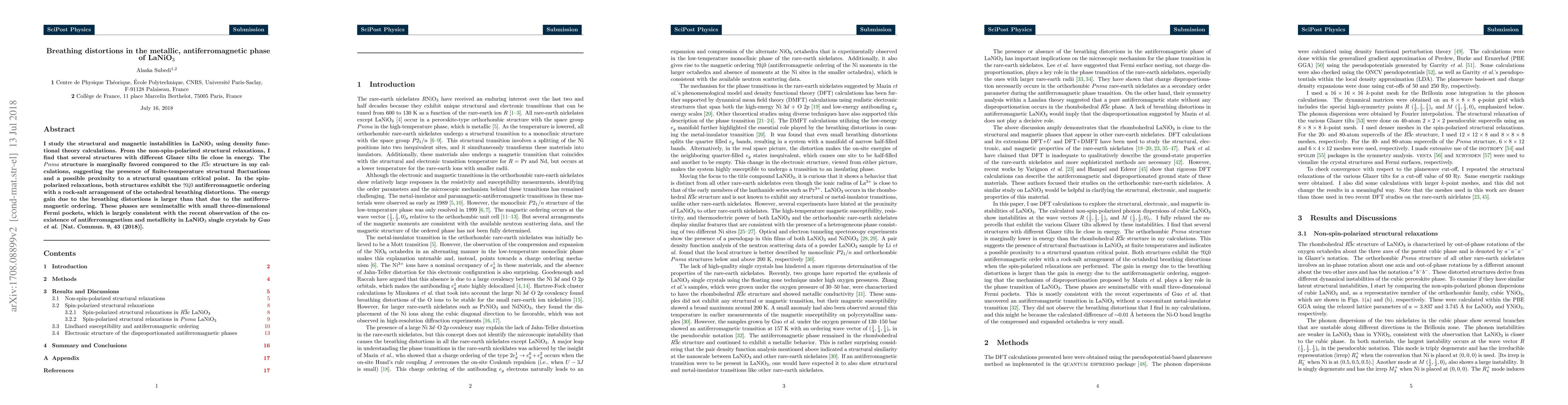 I study the structural and magnetic instabilities in LaNiO$_3$ using density functional theory calculations. From the non-spin-polarized structural relaxations, I find that several structures with different Glazer tilts lie close in energy. The $Pnma$ structure is marginally favored compared to the $R\overline{3}c$ structure in my calculations, suggesting the presence of finite-temperature structural fluctuations and a possible proximity to a structural quantum critical point. In the spin-polarized relaxations, both structures exhibit the $\uparrow\!\!0\!\!\downarrow\!\!0$ antiferromagnetic ordering with a rock-salt arrangement of the octahedral breathing distortions. The energy gain due to the breathing distortions is larger than that due to the antiferromagnetic ordering. These phases are semimetallic with small three-dimensional Fermi pockets, which is largely consistent with the recent observation of the coexistence of antiferromagnetism and metallicity in LaNiO$_3$ single crystals by Li \textit{et al.} [arXiv:1705.02589].